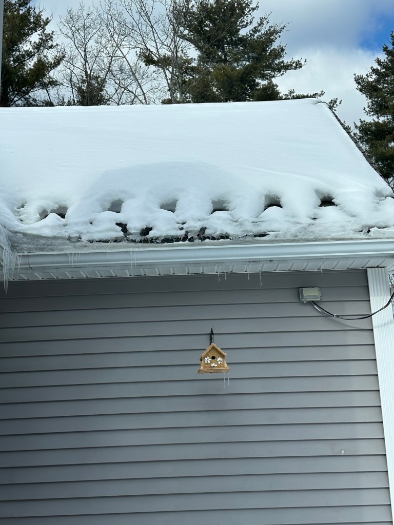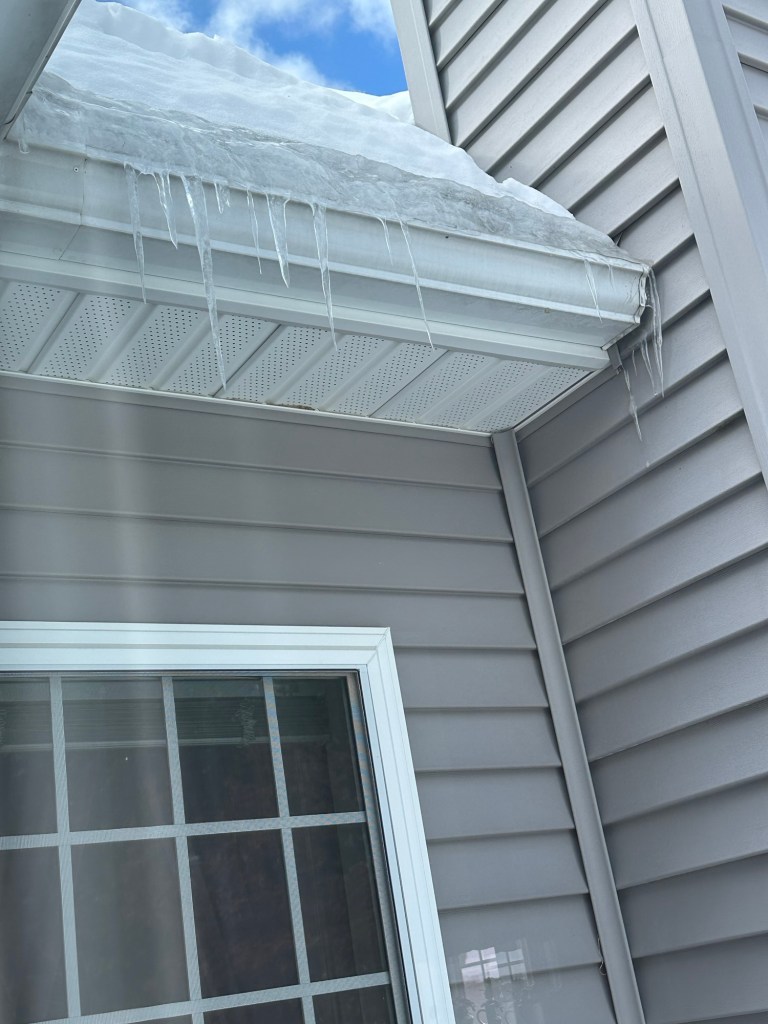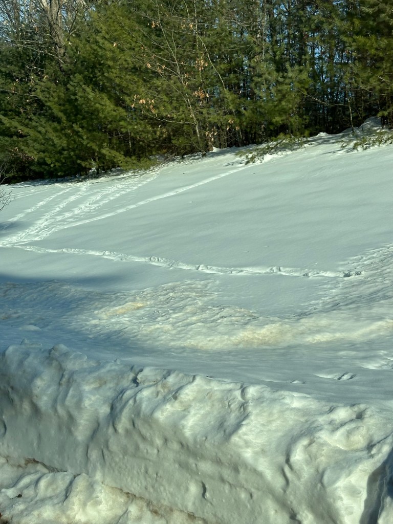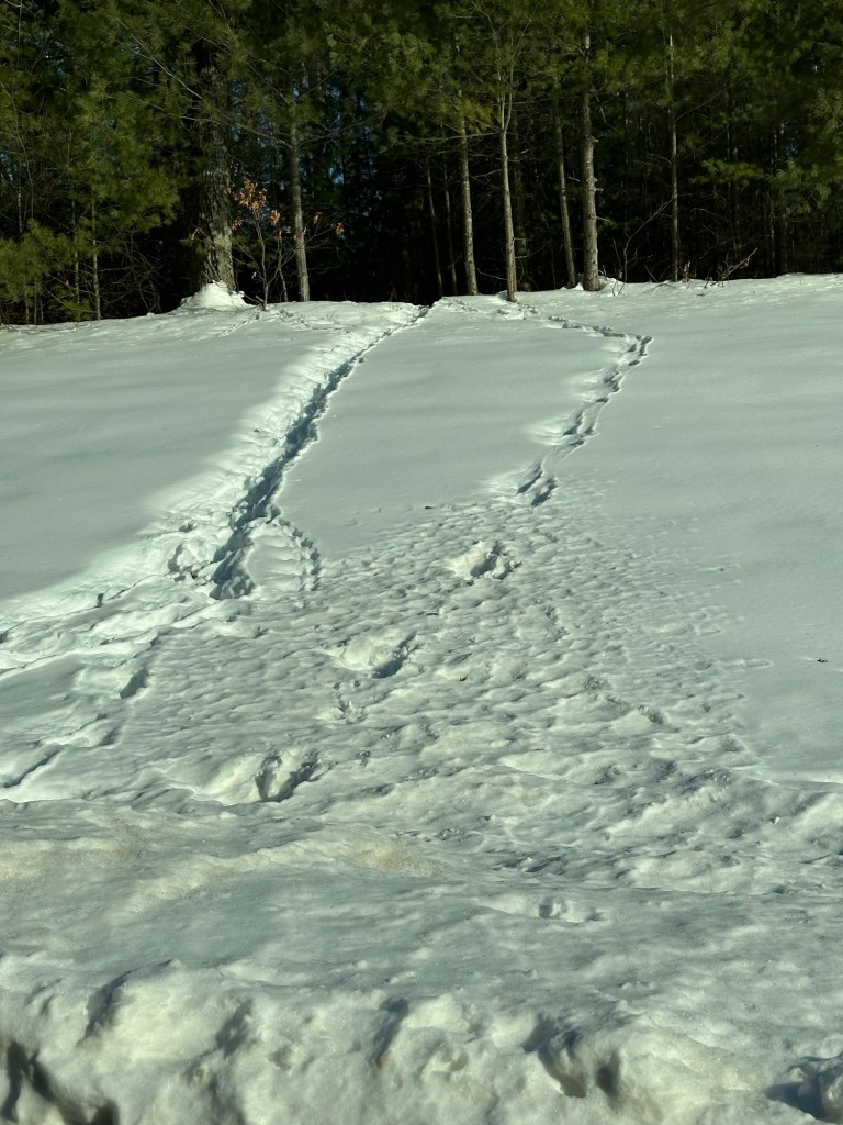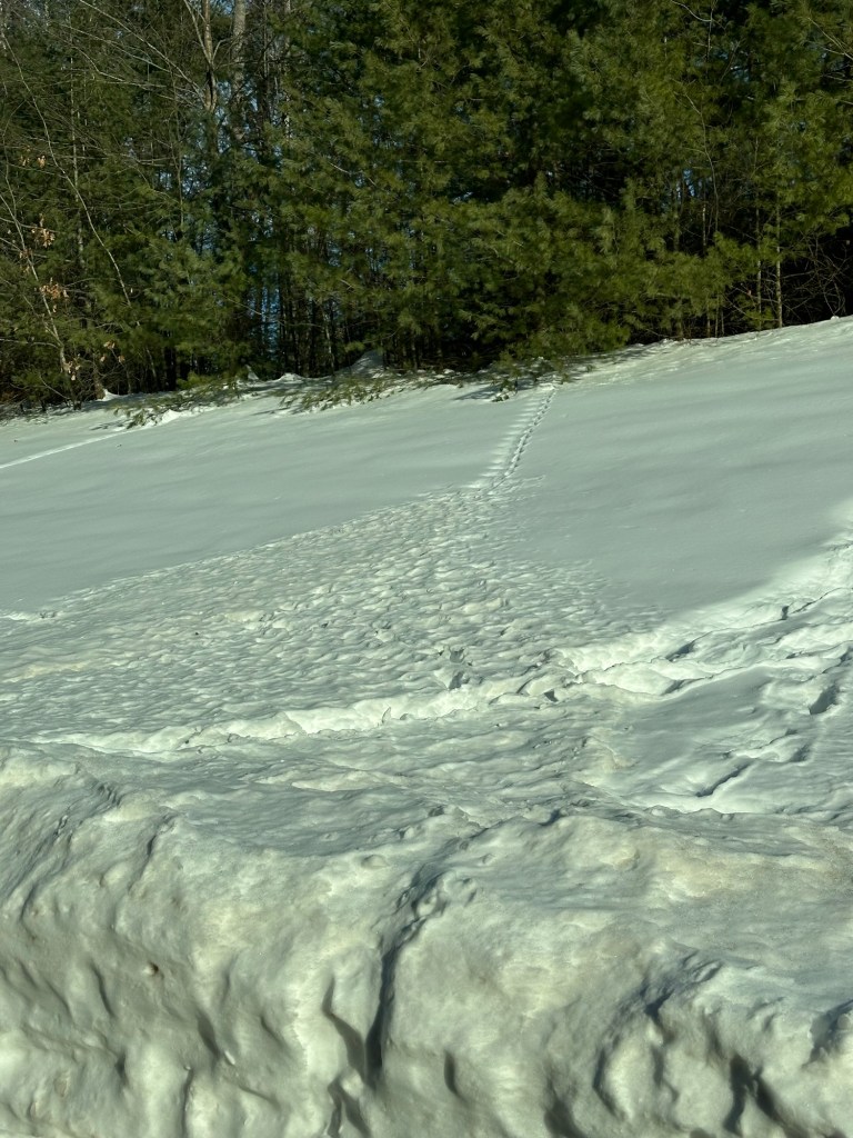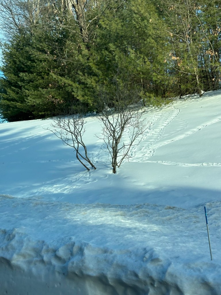 Arborvitae looking thinnerAnimal tracks in the snowMore animal – deer and others Ice dams that are melting from our heat tape and one day of temps over freezing mark.