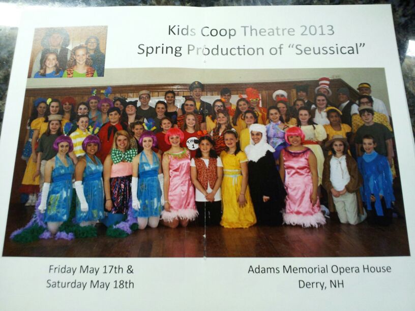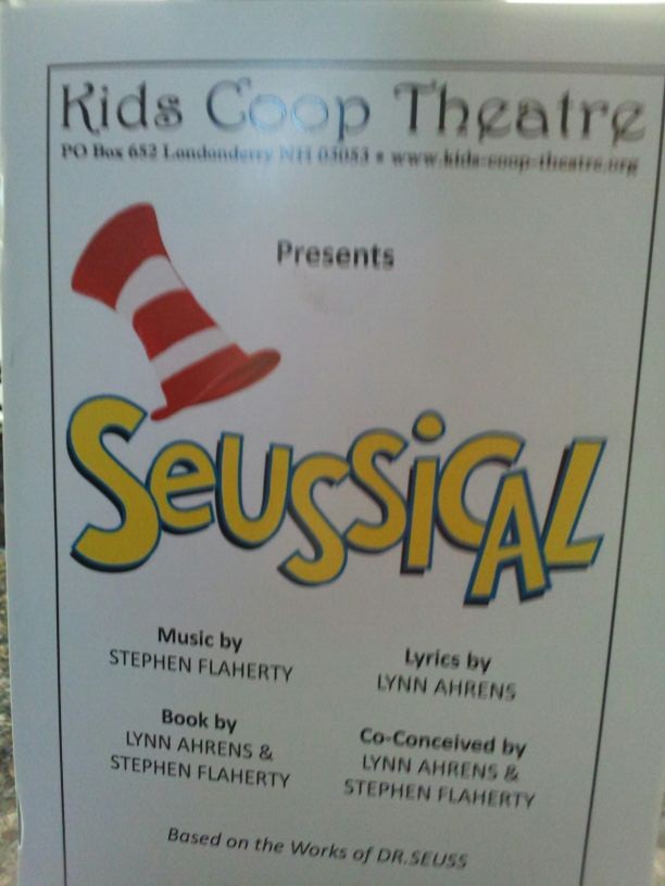 On Saturday at 1:00 I attended the Kids Coop play, Seussical, put on by Kids Coop Theatre in Derry, NH.  The Theatre is housed in the Adams Memorial Building.  This play was an unforgettable experience!  What a delightful show with plenty of colorful costumes and props and background (made by talented staff and parents) and amusing songs.