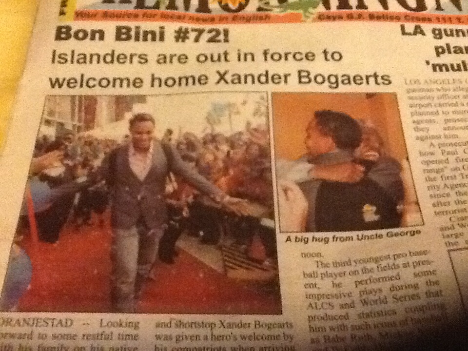 I am vacationing on the beautiful island of Aruba!  This is the same island that Xander Bogaerts, third baseman of the 2013 World Series Champion Red Sox, lives.  The island welcomed their famous son home this week with much fanfare.  He is beloved and admired by all Arubans.