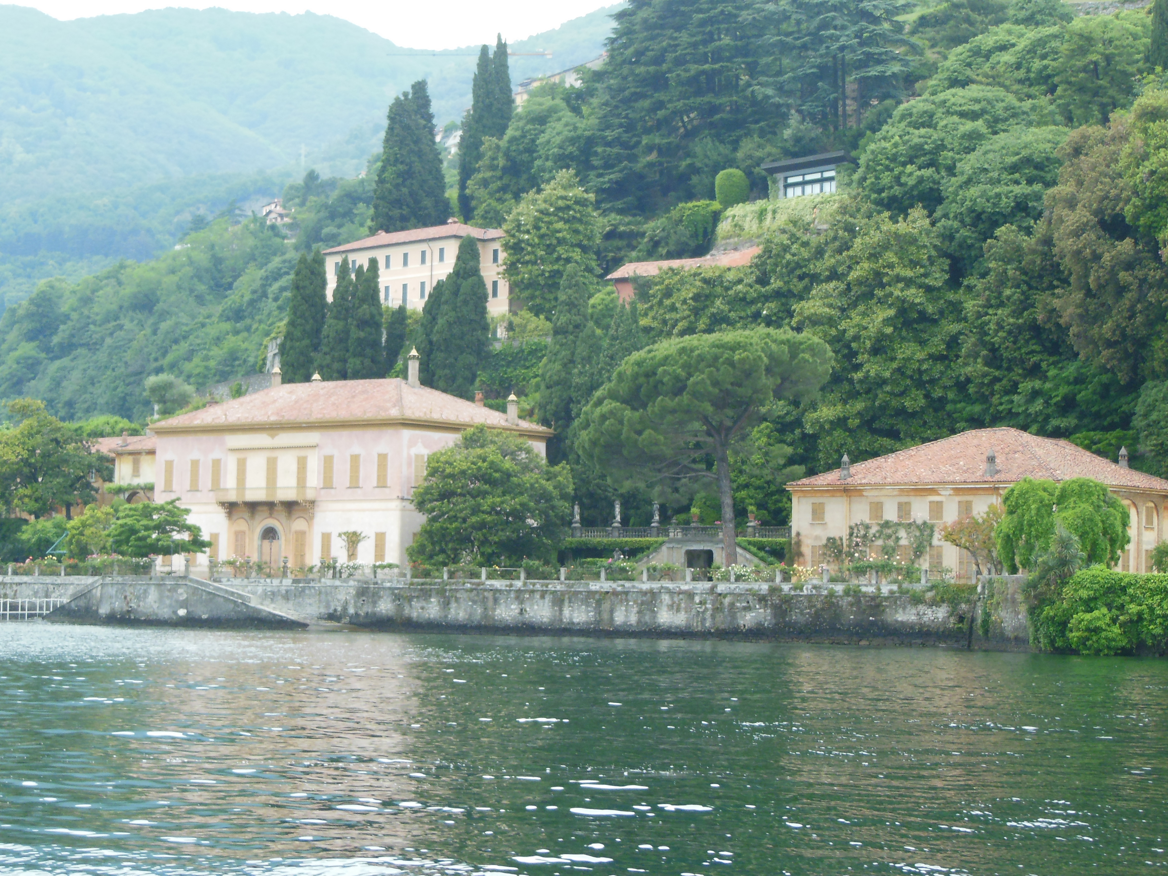 We took a private launch to the Borromean Islands to visit the palace of the Borromean Princes which was enormous and very ornate in furniture and wall hangings, not at all homey if you know what I mean. The grounds were beautiful and we saw a few white peacocks. This day it rained very hard at times but we perservered and managed to get some foggy pictures. Luckily we remember how beautiful it all was. We were very fortunate to have good weather up to this point. Could have used some Limoncello here too!  But, alas, none to be had! Lol!
