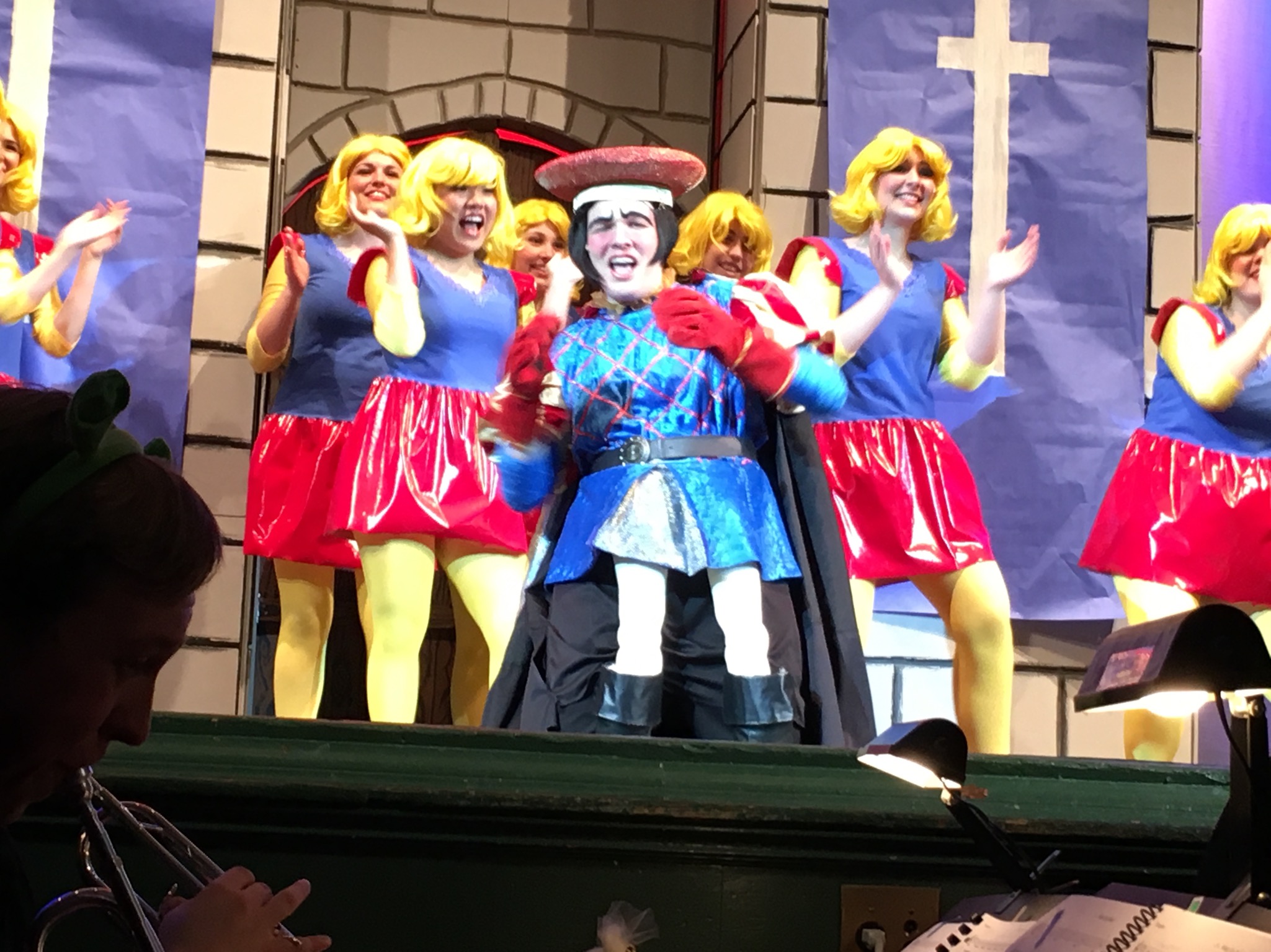 Lord Farquaad was in a costume with dummy legs while he knelt on his knees the whole performance just to make him look small. This was comical to see and brought the audience to hysterics.