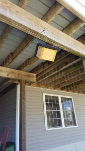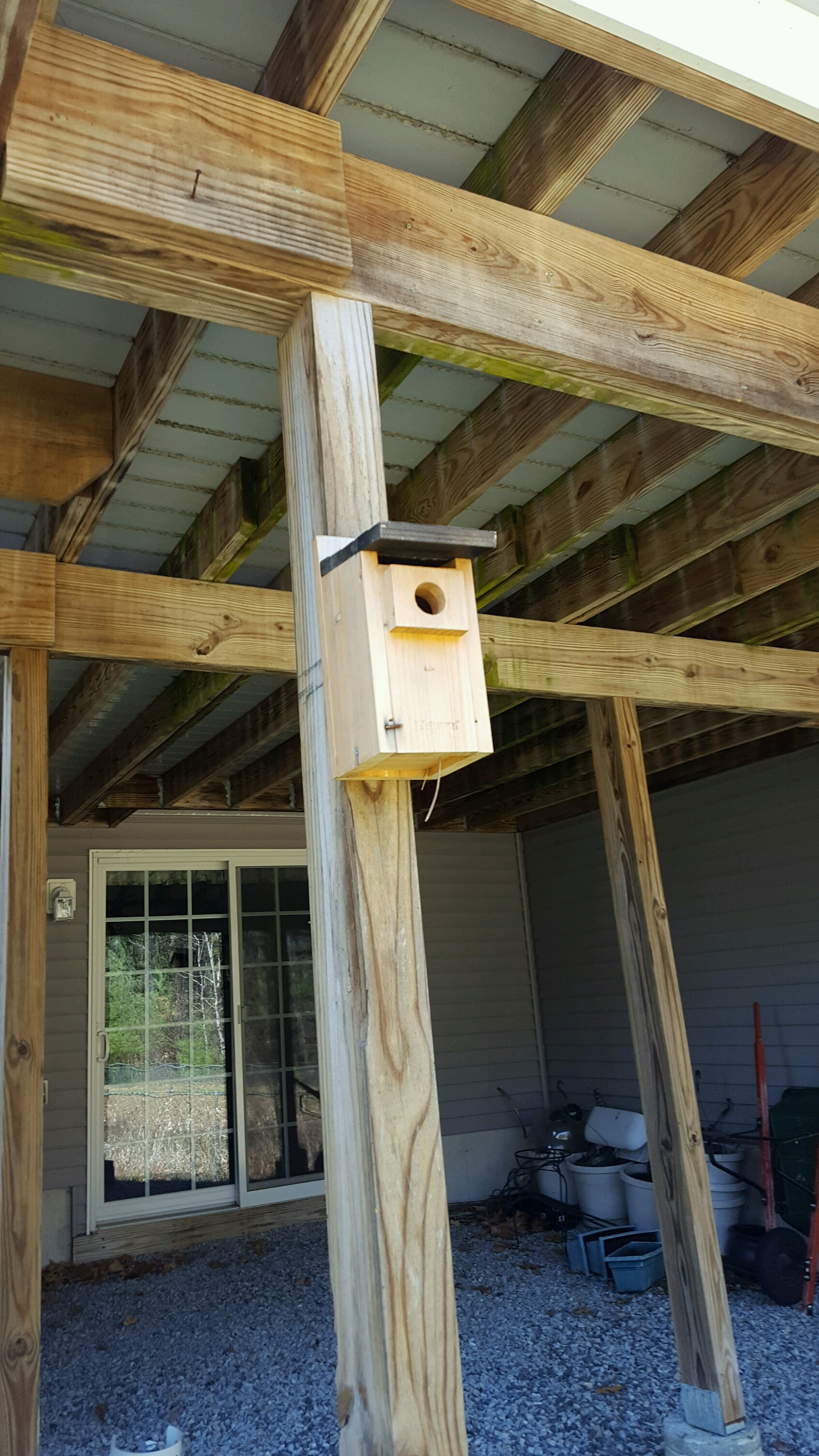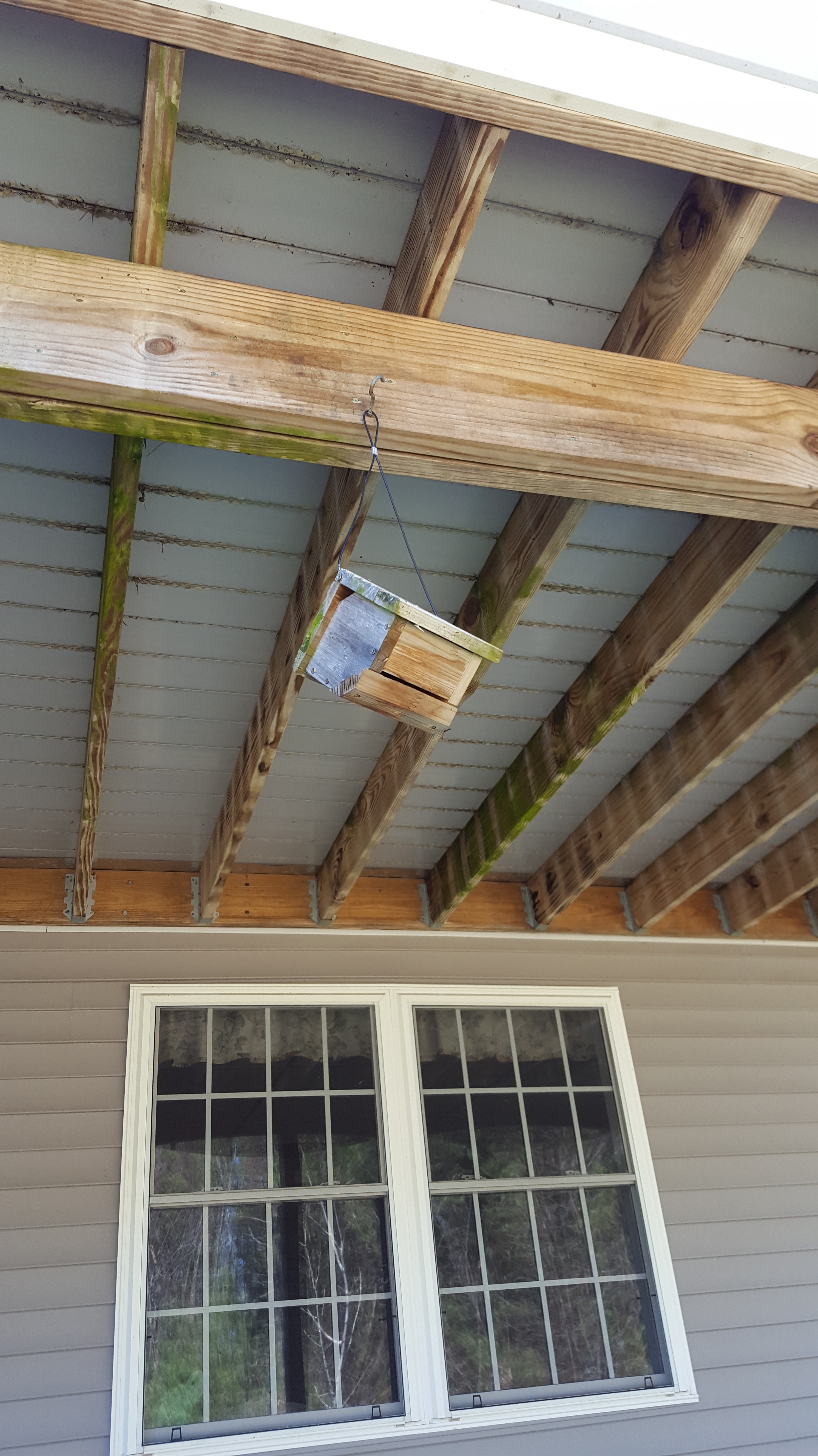 If you look closely at this little birdhouse you will notice there are some twigs sticking out at the bottom. A sure sign that we have some baby birds in there nesting. We actually see little birds being fed by their mother on our deck. They come up once they can fly and sit on our railings and wait to be fed by their mothers. So sweet!