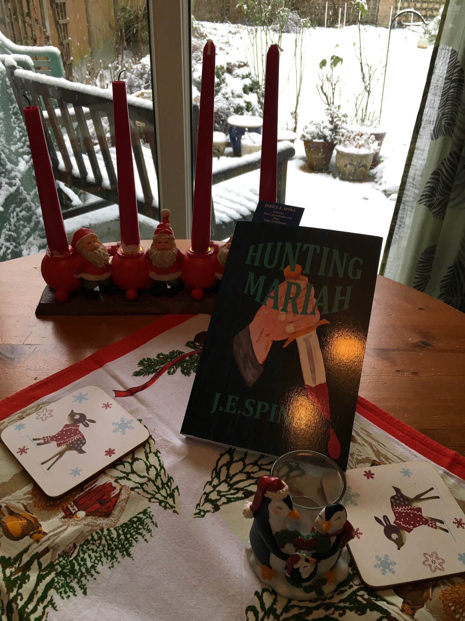 I recently received a surprise. One of the winners of my 5th Blogging Anniversary drawing – Annika Perry – sent me a photo of the book she won, Hunting MariahShe made it look so festive in the center of her lovely table decor. Thank you, Annika! You just gave me an early Christmas present by showcasing my novel!