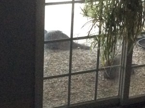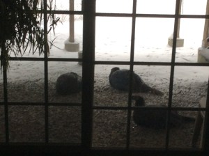 I don’t get excited over the turkeys any more because they are too plentiful and frequent visitors. At the moment there are four turkeys huddled under our deck trying to keep dry and warm. I snapped a photo from my stairway and enlarged it. You can only see three lying down. I didn’t want to get too close and disturb them.