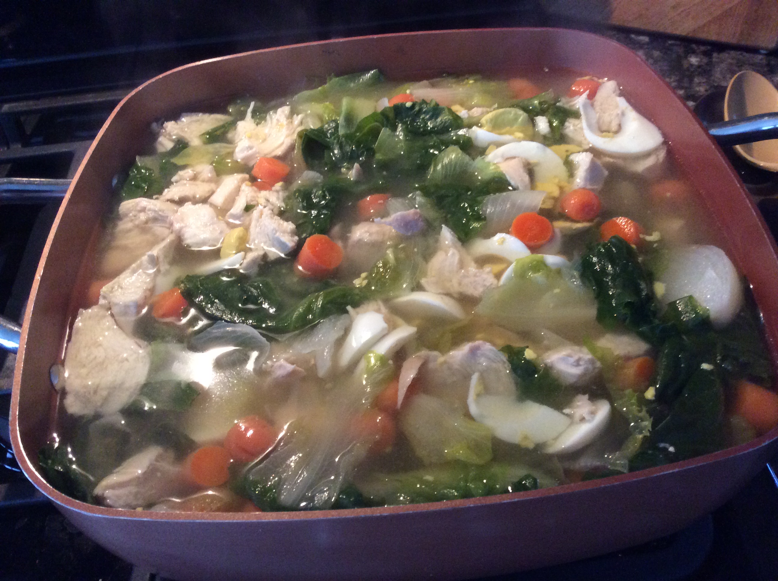 Quartered onion, Chicken Breast (whole) chopped, sliced hard boiled eggs, pastina, acini de pepe or brown rice, escarole, sprinkle or two of garlic powder, salt and pepper to taste, chicken bouillon 8 oz or more, chopped celery and carrots. The more bouillon you use the lest salt you will need. I fill my pot with more water than bouillon.