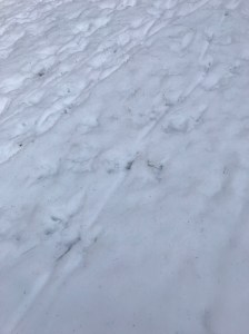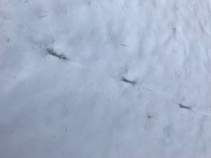 Oh, I almost forgot. The snow is wonderful for capturing animal prints like the one above and others below. We see the footprints of dozens of turkeys, deer, rabbits, raccoons, and other creatures that I can not identify. Bear are expected to come out of hibernation soon. We may need to pull in our bird feeders. The raccoons are trying to pull the feeders down now and have left a mess on our snowy deck from all their detritus or whatever you call their doo doo.