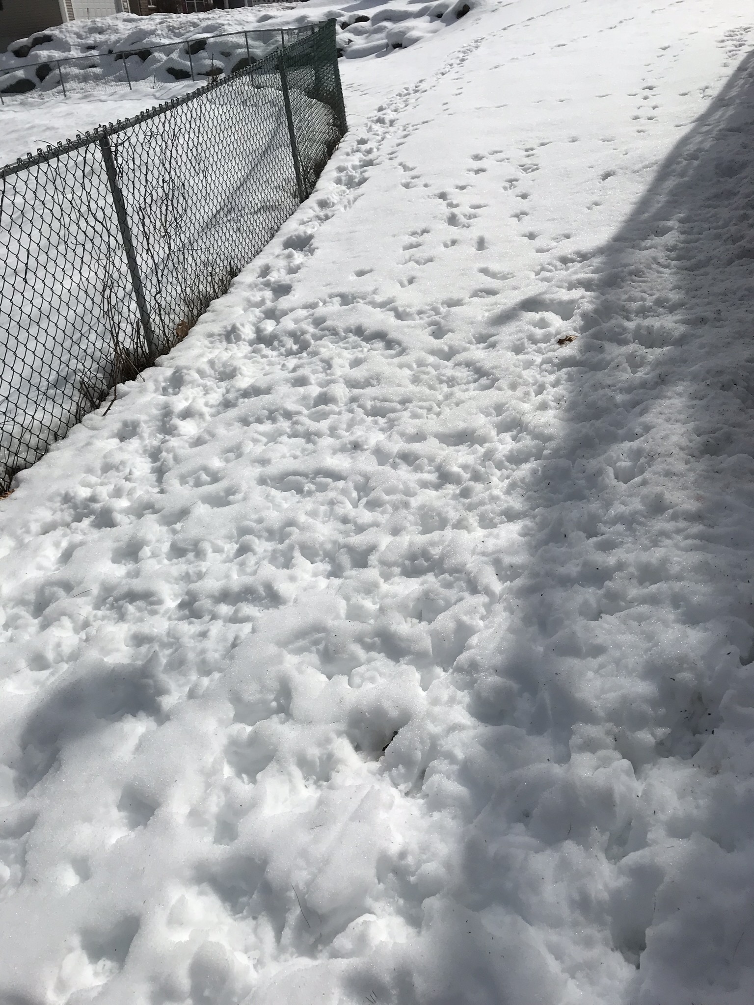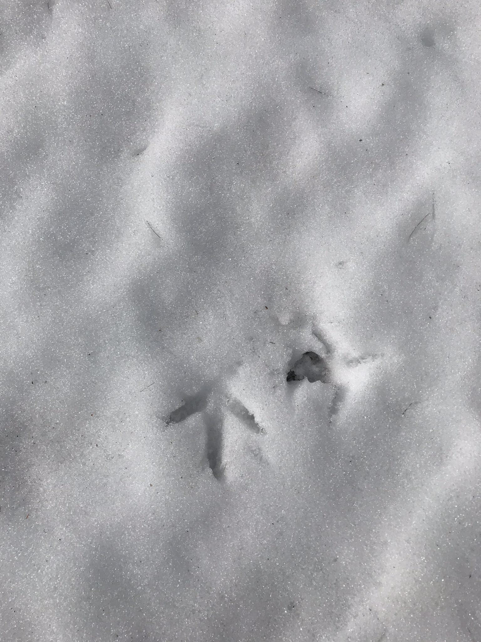 Oh, I almost forgot. The snow is wonderful for capturing animal prints like the one above and others below. We see the footprints of dozens of turkeys, deer, rabbits, raccoons, and other creatures that I can not identify. Bear are expected to come out of hibernation soon. We may need to pull in our bird feeders. The raccoons are trying to pull the feeders down now and have left a mess on our snowy deck from all their detritus or whatever you call their doo doo.
