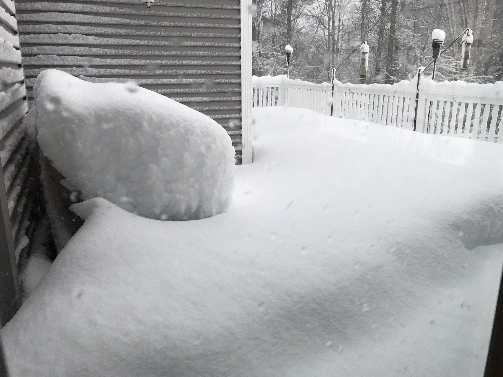Here in the Northeast (New England) USA we still have snow that blankets our yards. It was officially spring a day ago but where is it hiding? The photo above is of our deck on March 8th from the first of four snowstorms.The snow was more than half way up our railings and at the sill of our window on the deck.