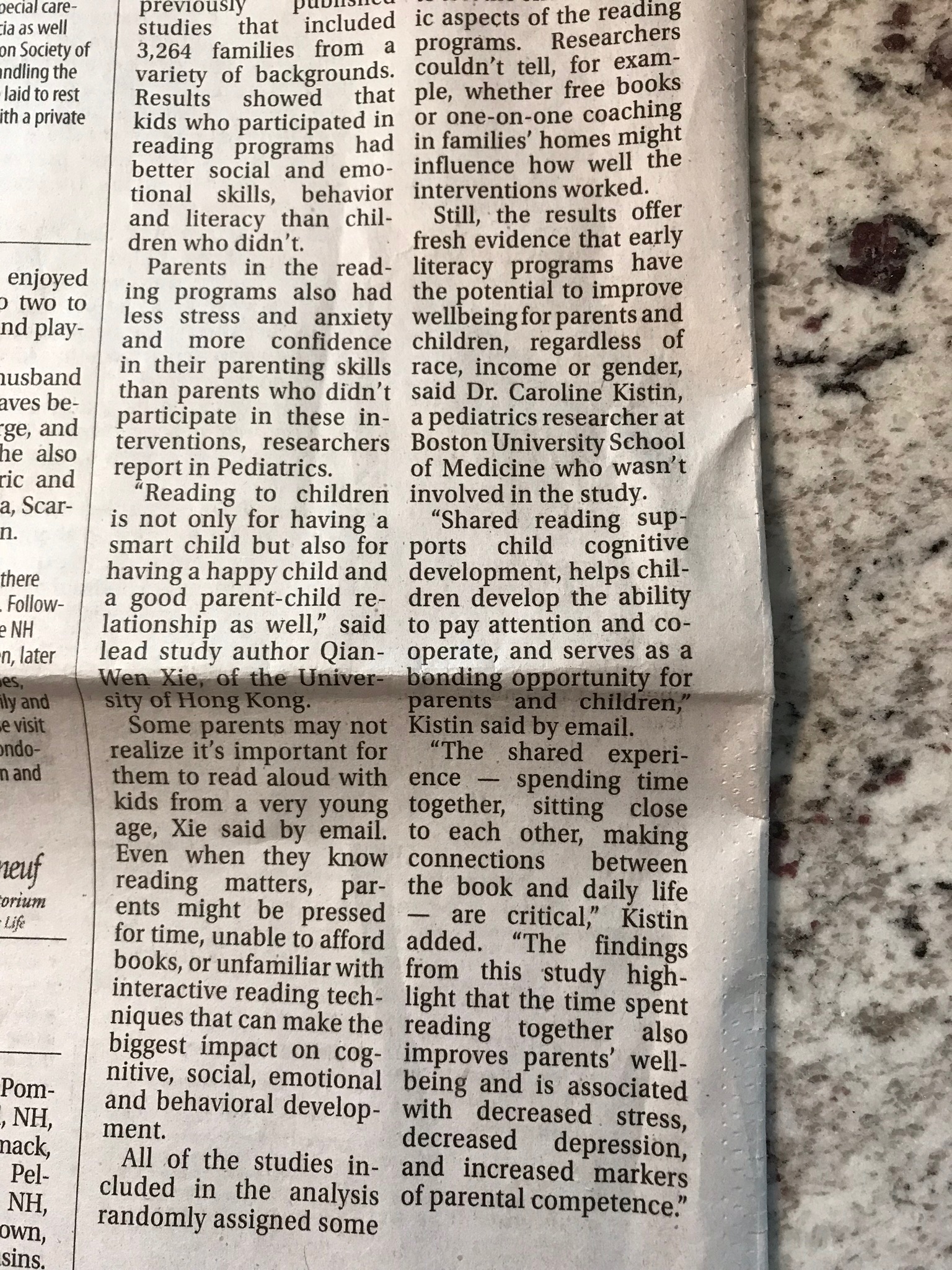 The shared experience — spending time together, sitting close to each other, making connections between the book and daily life — are critical, Dr. Caroline Kristin, a pediatrics researcher at Boston University School of Medicine, added. The findings from this study highlight that the time spent reading together also improves parents’ well-being and is associated with decreased stress, decreased depression, and increased markers of parental competence.