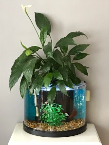 The violet is wearing its deepest purple flowers to show off and the lily lives off of the beta fish which in turn gets its nutrition from the plant.
