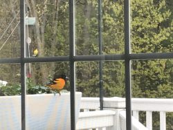 Also, I want to share some new photos of one of our visitors – the magnificent Baltimore Oriole. He came to visit to eat the grape jelly and half an orange that John put out for it. But this time he brought along his mate. She is lighter in color and more muted but still beautiful. She is waiting not so patiently on top while her mate eats his fill of the orange and grape jelly.