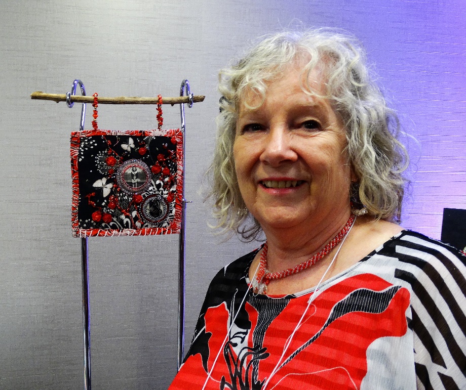 Photo: Lynda McKinney Lambert with her First Prize Winner, Girl on a Bench SeesVisions of butterflies, at the InSights18 international exhibition in Louisville, KY.  Lynda creates mixed media fiber art talismans and wall pieces at her River Road Studio, in The Village of Wurtemburg, PA.  She established her fine art studio in 1976.  Lynda’s art is exhibited around the world and she has been in over 400 exhibitions in galleries & museums. Her art is in private and public collections world-wide.