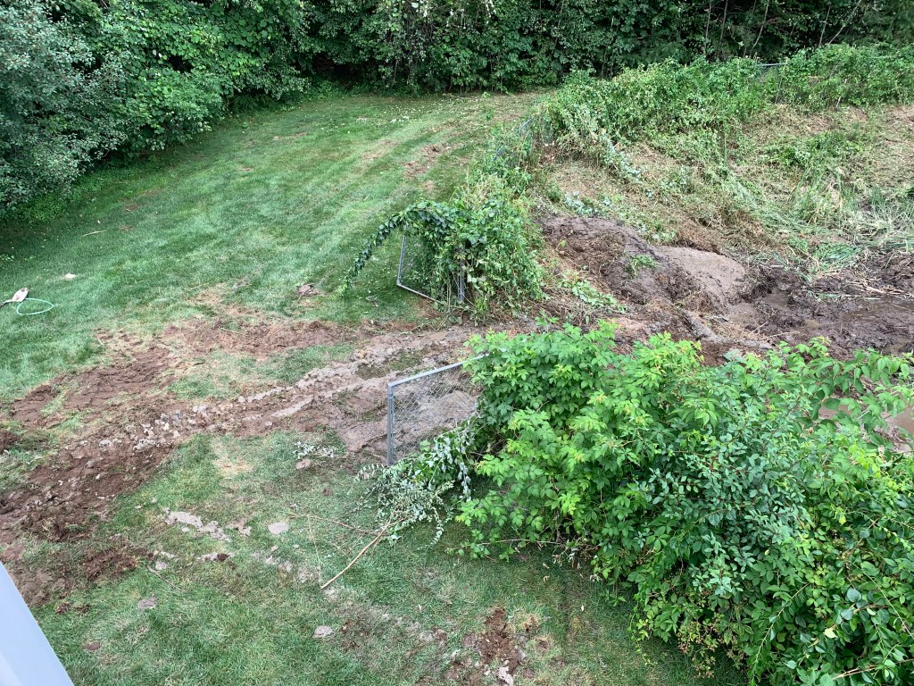 They left behind muddy tracks and clumps of grass all over. Sigh! Now we wait! We’ve been through this before! Phew! This pond is supposed to be cleared out every year or so but this year with all the rain it has grown immensely. It is gotten too far ahead of the landscaper to deal with, but it has to be done.