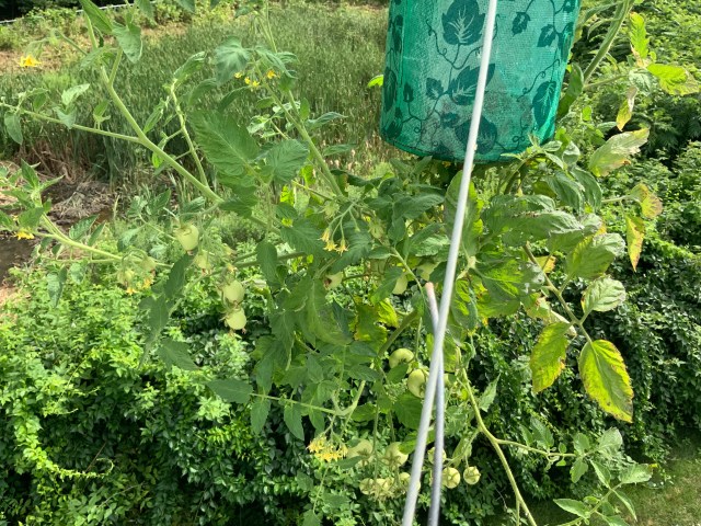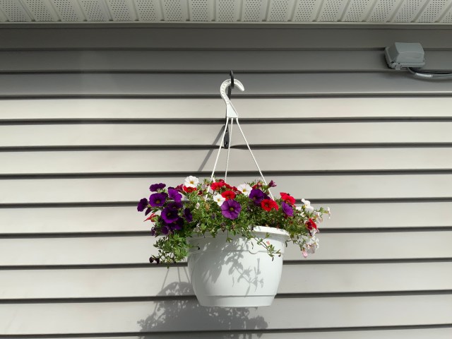 John planted some plum tomatoes in a topsy turvy planter which he hung from our back deck. Here it is with many plum tomatoes already. Can’t wait to try some. He’ll be making some sauce. Yum!
