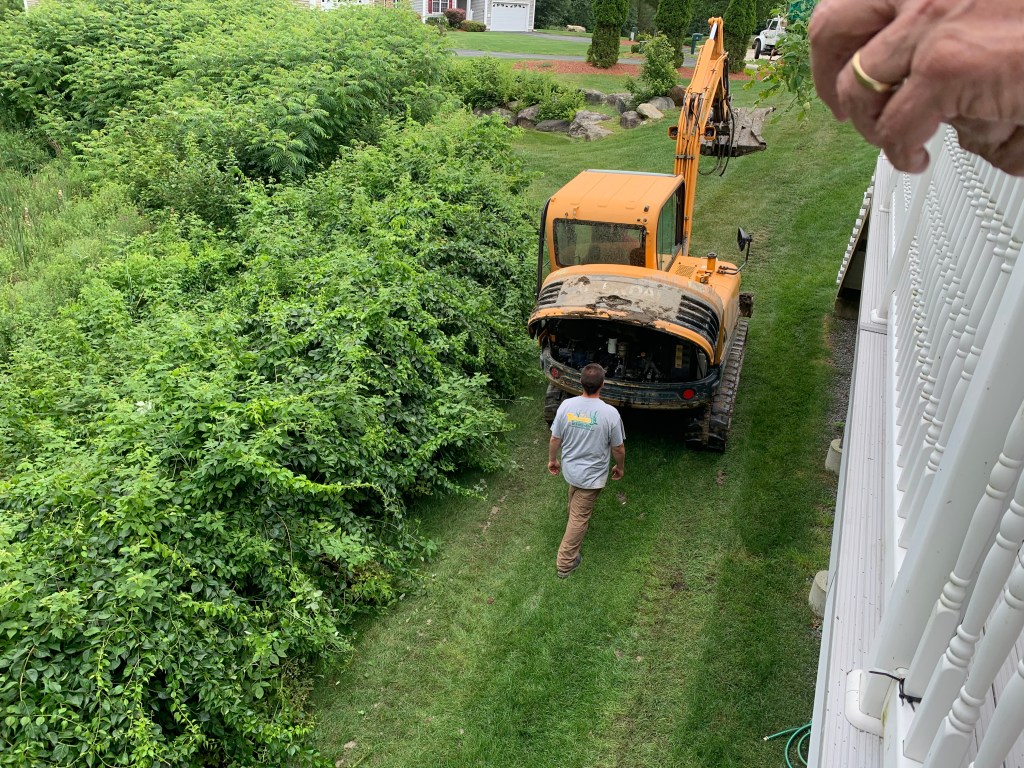 Here it is as the landscapers begin to cut it back. There is a fence around it but in the above photo you can’t even see the fence. We are being invaded by this bittersweet vine that clings to everything and chokes the life out of other plants. One of the main reasons the pond needs to be clipped back every year.