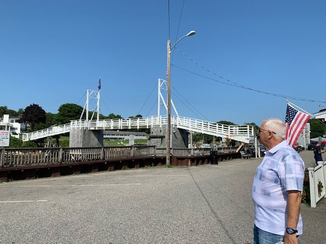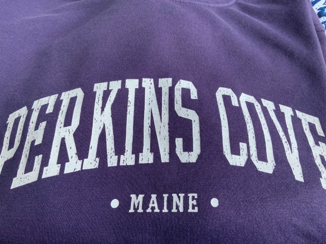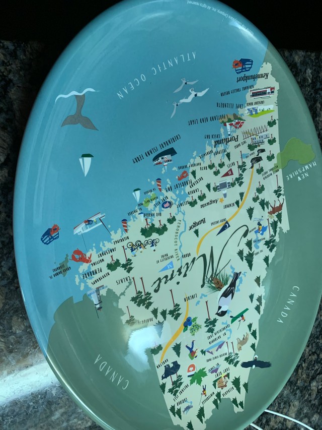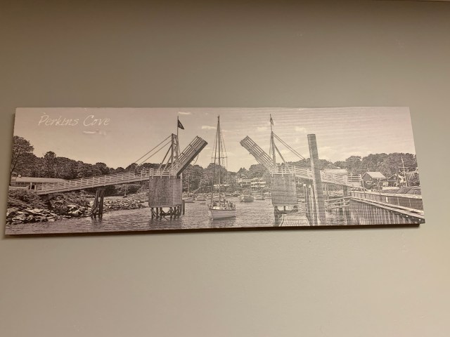 We shopped in some of these shops and also at some of the downtown ones and found a plastic serving dish with a Maine map on it, a small wooden condiment tray, a sweatshirt, and a plaque with a photo of the bridge to Perkins’ Cove below.