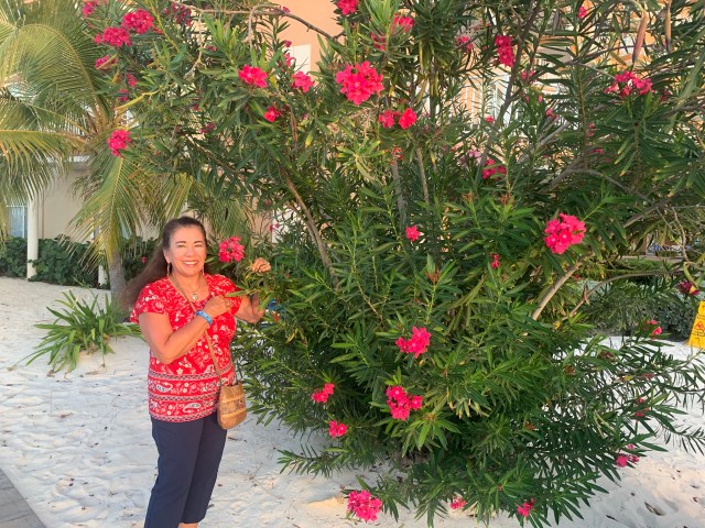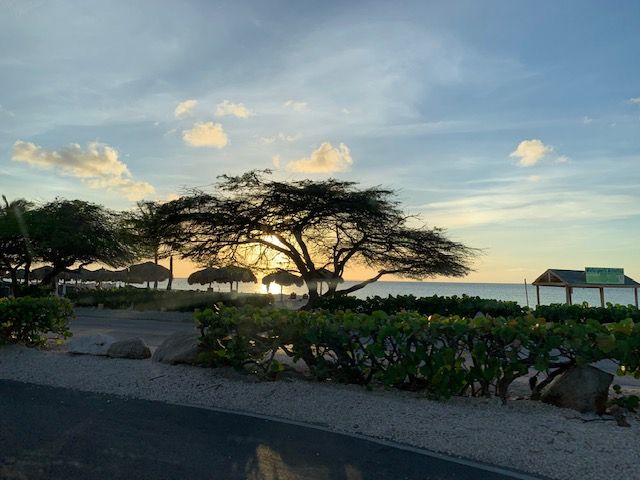 Here are more photos of the last few days in Aruba. We will enjoy every minute until we can return again next year! We snapped a few on our way to dinner on Tuesday. I love this flowering bush. It’s a flowering cactus. There are plenty of cacti on the island since this is a desert island but you will see lots of palm trees too which were brought in from other islands. There are also Divi Divi trees which are one of the only indigenous trees on the island. They grow in the direction of the wind.