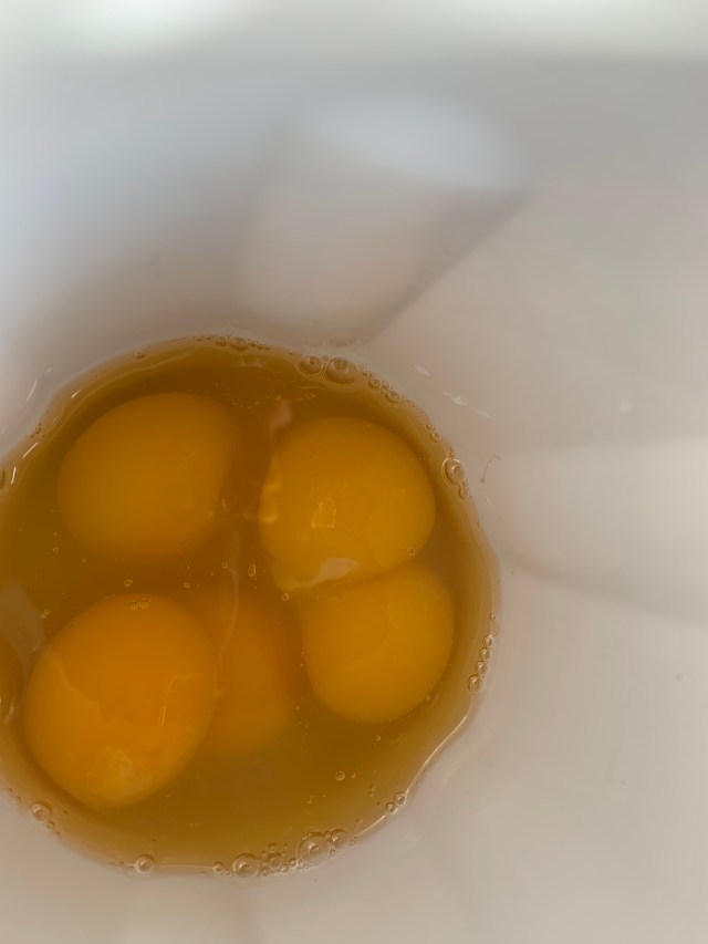 As I was cracking eggs to begin baking I came across 5 double yolk eggs – one egg with two yolks (fraternal), and the other four with twin yolks out of a dozen. I have never seen this many double yolks in one dozen. I had to snap a photo of a few of them.