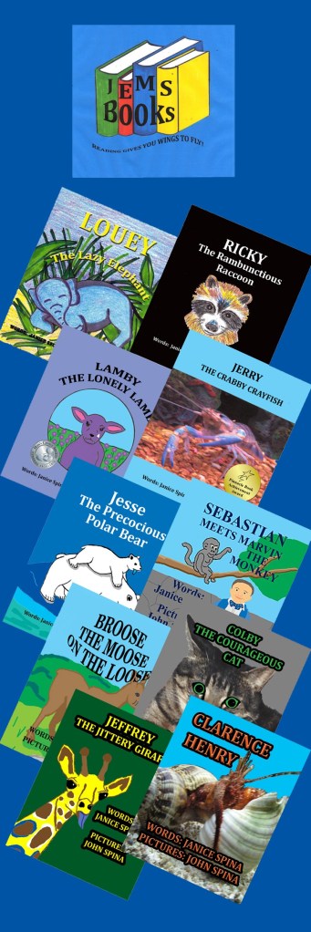In 2013 I made the decision to self publish after receiving Dear Janice letters from several publishing houses. Since then I feel free and happy to have done so now with 26 books (and counting) published on my own. I’m not saying it has been an easy road to traverse, on the contrary, it has been a difficult one. At times I felt despondent and wanted to stop publishing but continued writing. But then I would write another story and my talented husband would illustrate it and create a beautiful cover forcing me to go on. I will continue to create more fun adventures and stories for all ages until I am no longer physically able to do so. God willing that that will be long time in the future!
