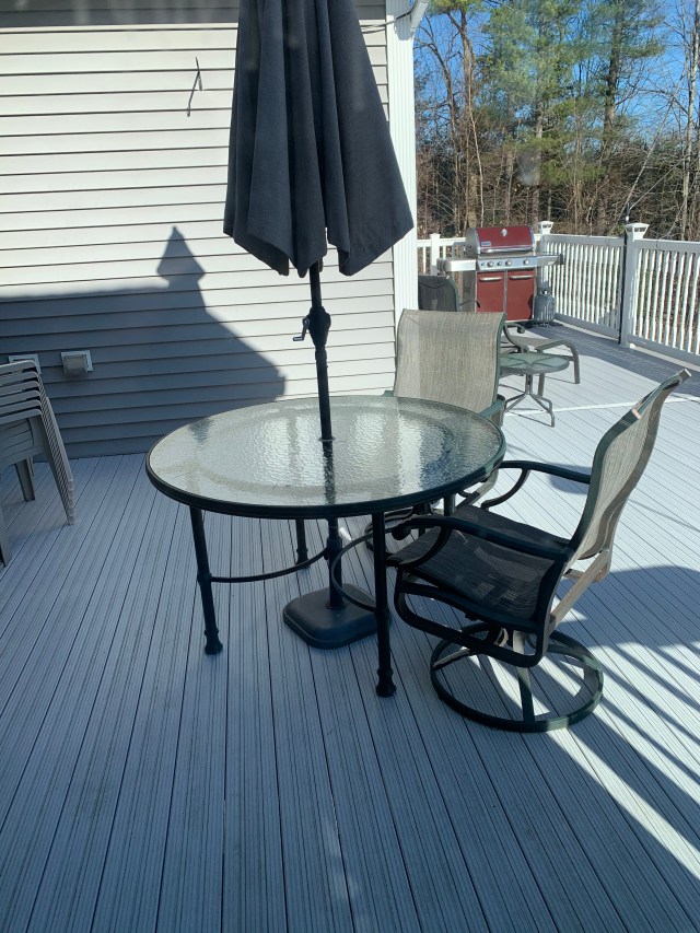 We are all set up for the spring and summer entertaining, but alas, there will not be any for a little while yet. This deck looks lonely but my husband and I will enjoy it until we can fill it once again with family and friends.