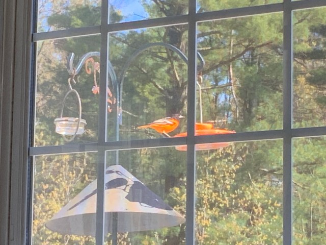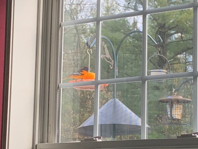 In 2020 the Baltimore Orioles arrived on 5/10/20! John had the feeder ready for him and her. We have a male and female who come each year. This year it looks like the female is smaller and younger. Could be an offspring of the former visitors. They know where the feeders are and come every year. I think it is ingrained in their genes. Photos of birds below.