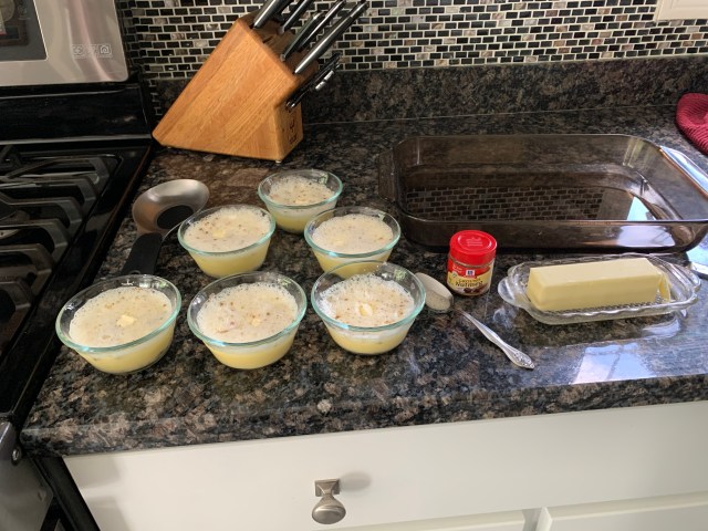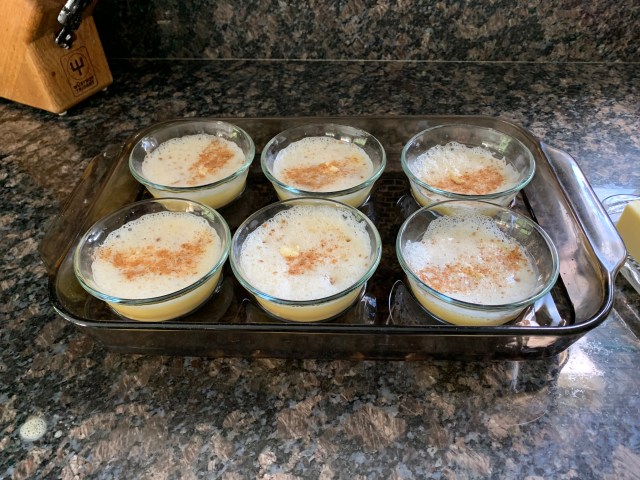 - Place custard cups into a 13 x 9 inch Pyrex dish filled half-way with water or you can use an 8 in glass dish and place into larger dish with water (this keeps the custard from burning.)