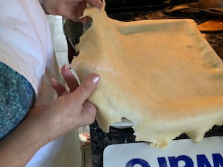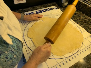 4. On lightly floured board place dough and slightly flatten dough into round or square shape (depending upon which size container you will use to hold pot pie)