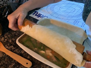 6. Put chicken and roux into the dish and cover with dough and cut a couple of slits in crust to vent