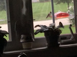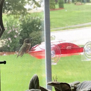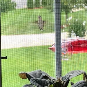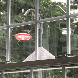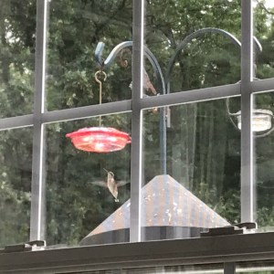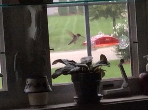 Here are some photos I snapped with my IPhone and iPad. I managed to capture a couple in mid-flight. We have three feeders for them which keep them flitting back and forth amongst these and the flowers. There’s plenty for them to eat. They need it too. They expel much energy just flying around forward, backward, up and down and upside down. They are the only birds that can fly upside down.