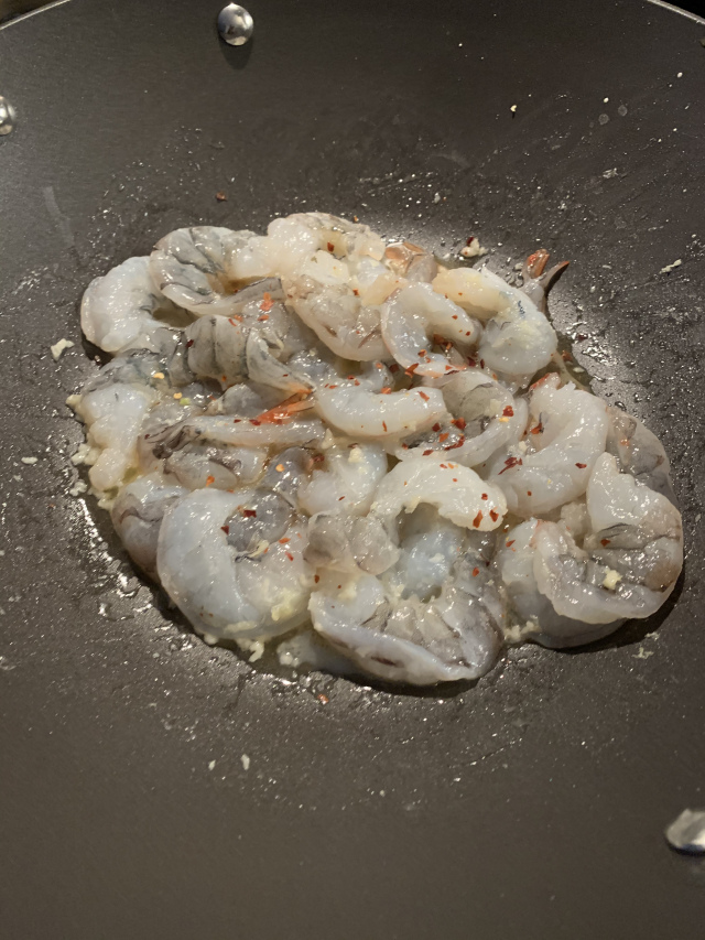- Melt butter in a large skillet over medium high heat. Add shrimp, garlic and red pepper flakes. (I used my wok which was perfect when I added the pasta.)