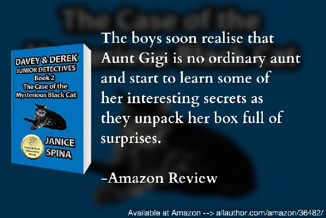 Davey and Derek Donato are twins, but not identical. They gleaned the idea to be detectives from a book their parents bought them on their tenth birthday. The twins discover a black cat and some magic when they visit with their Great Aunt Gigi. The cat tries to communicate with the boys. But what does the cat want to tell them?