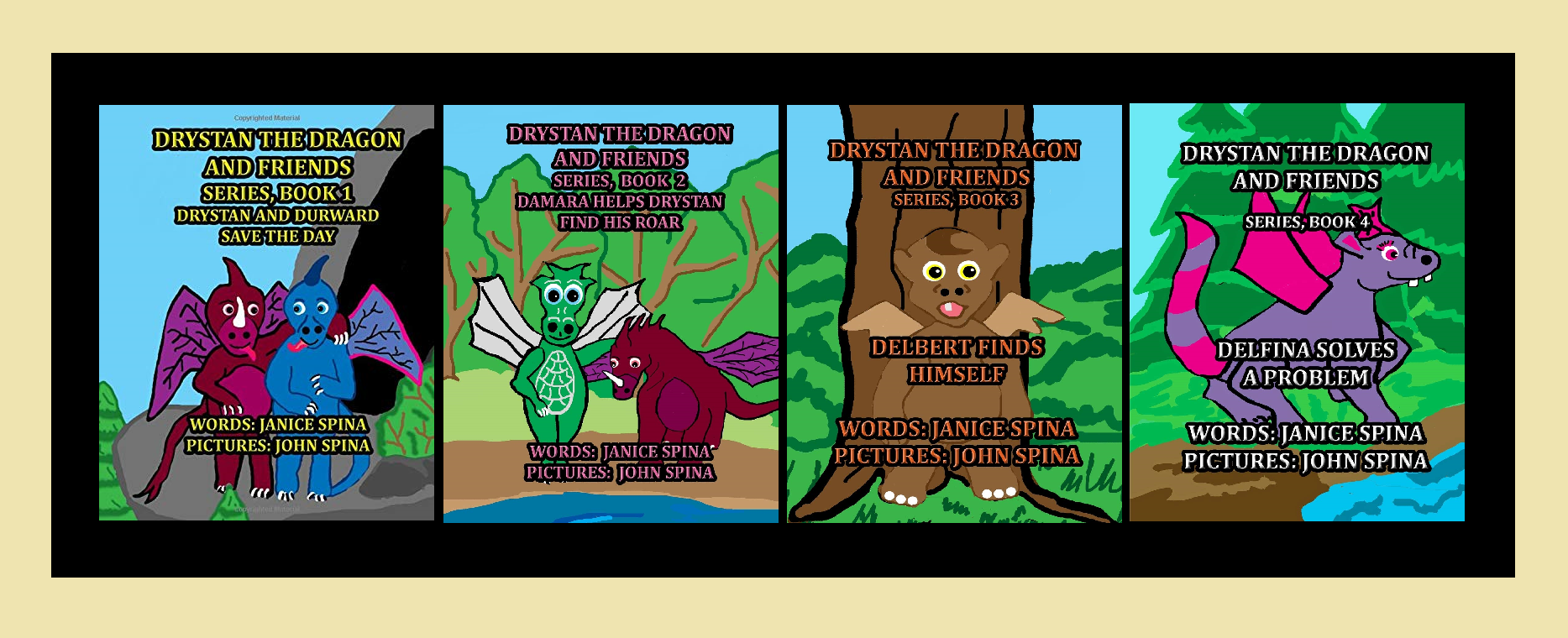 It is a fun, educational series for children to learn letters, colors, good behavior, friendship, respect, and kindness toward others. Check it out today! Your children will love the rhyming and descriptions of each dragon. There is a poem that introduces a new dragon to each book. All dragons’ names begin with the letter ‘D’ and their colors will be in brilliant shades of blue, green, red, purple, pink, orange and brown. A fun series for kids to enjoy while learning new things at the same time. This series will keep them occupied and happy all year round. Children will love reading these books and they may become their favorite books at bedtime and any time. The illustrations and covers were created by my husband, John.