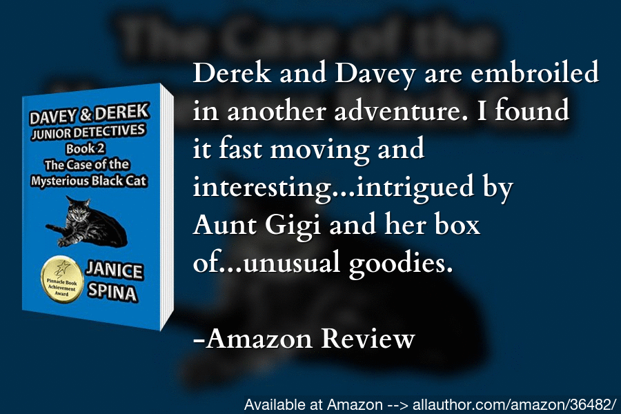 The backstories about Davey, Derek and Mickey are well covered at the beginning of the book, enabling the reader to know the most important details of the main players in the story. It impresses me that Janice Spina wants her readers to have the full advantage of character details to be able to connect with them more, without forcing the reader to buy earlier books in order to do so. The addition of magic to the mystery was a big twist which gave an extra huge element of excitement, adventure and super possibilities for the twins’ future cases which need to be solved. I found The Case of the Mysterious Black Cat to be an excellent magical tale and very much look forward to Davey and Derek’s next adventure. The author’s writing and imagination are incredible. I recommend this book to those in the 7-12 age group, or even the young at heart who love a little bit of magic served up with their mystery.