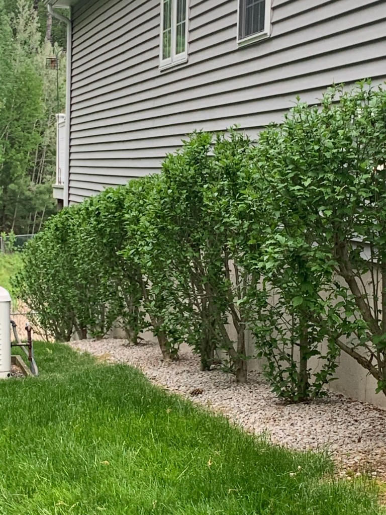 The 17 Rose of Sharon plants that are on each side of our house and in the front produce beautiful flowers with deep stamens that house more tasty nectar for the hummingbirds. No wonder they keep coming back. We produce a smorgasbord of foods for them. The Rose of Sharon will not bloom until late July or early August but are now showing some greenery.