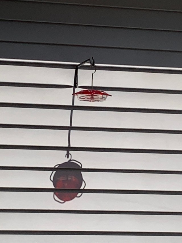 Today, 5/7/21, I snapped a photo of a hummingbird for you. It may be hard to see him but if you enlarged the photo you can see him in flight as he hovers over the feeder. He does blend in with the trees in the background. Once there are more leaves you will be able to see them better when I take photos. It’s not always easy to get them in flight. They are too quick for the eye and so tiny. This one is darker in color. We have had ruby throated and emerald ones with gorgeous colorings on their wings that appear to glisten in the sunlight. Startling to the eyes to see this but so gorgeous and unforgettable.