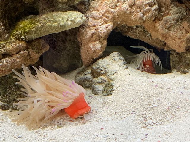 Anemones getting settled (two in the front and one inside the cave in the rocks.)