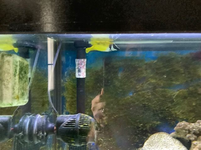 Tank with one new fish a Gamma up in the left hand corner (purple & yellow)Also Foxface is mirrored in the glass on the bottom left (yellow & black) Do you see him?
