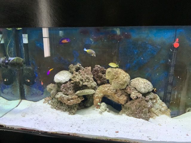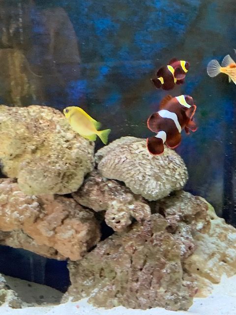 We now have two clowns, a gamma, brown tang, wrasse, spiny puffer, rabbit fish and coral beauty. The newest ones are the puffer and brown tang.