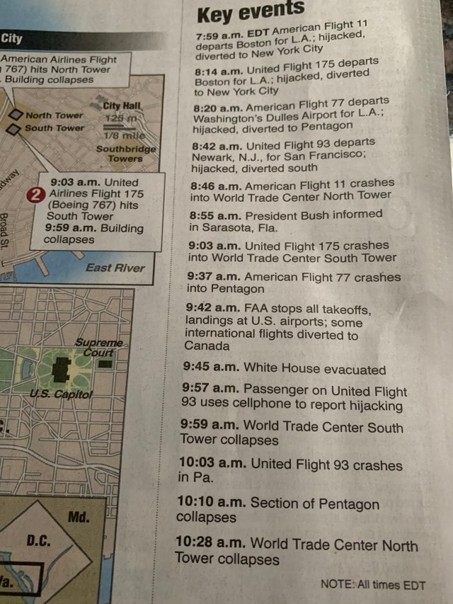 There are some terrible days in history that I will never forget and know exactly where I was when each event happened. This is one of them. I was working and saw on TV the second plane hit the South Tower with the other plane sticking out of the North Tower. I will never forget the horror and terror for those who were inside the buildings, the feeling of helplessness and not knowing what was happening at the time. It couldn’t be an accident twice. I pray that no country will ever have to go through such a devastating event again.
