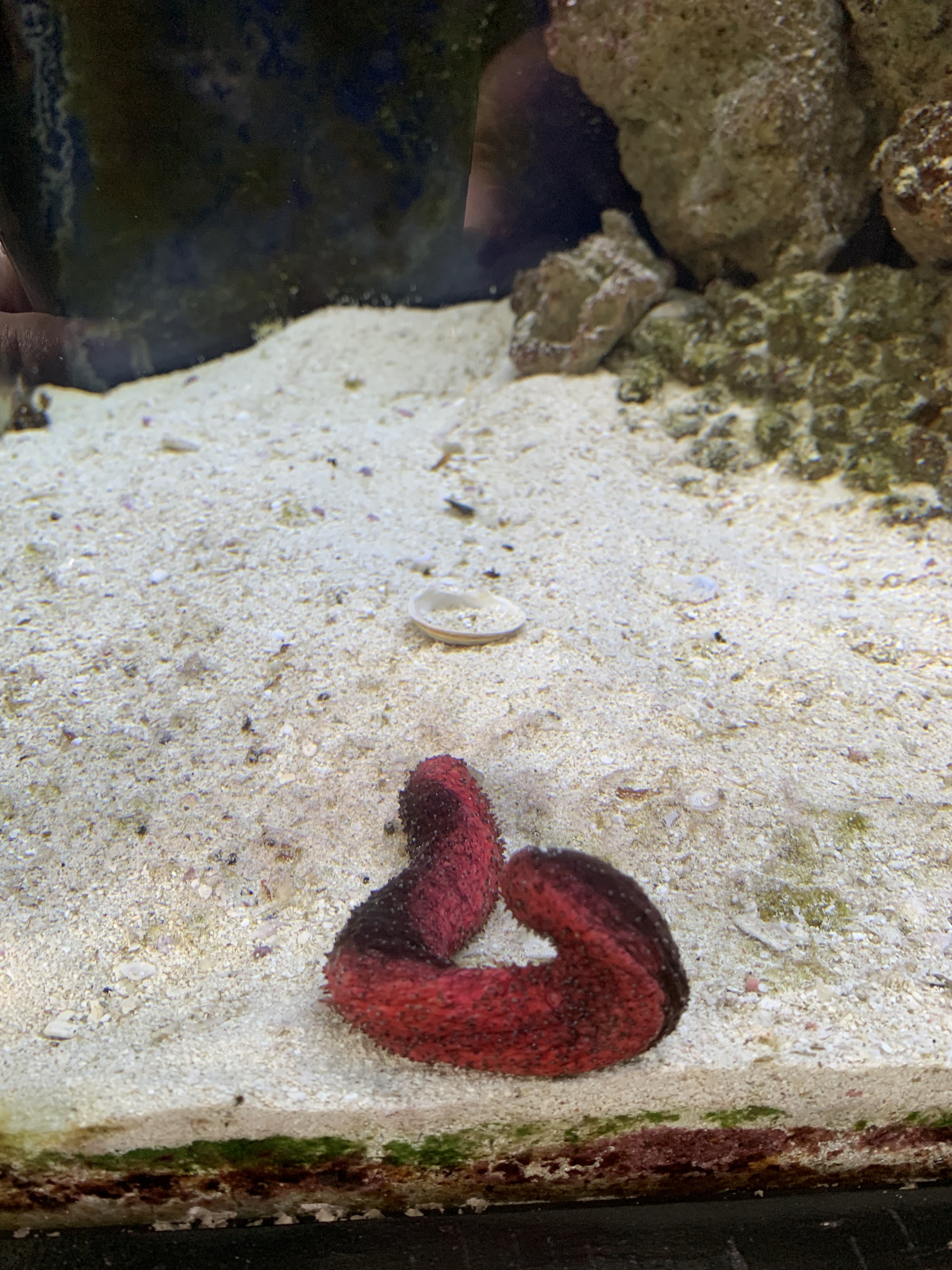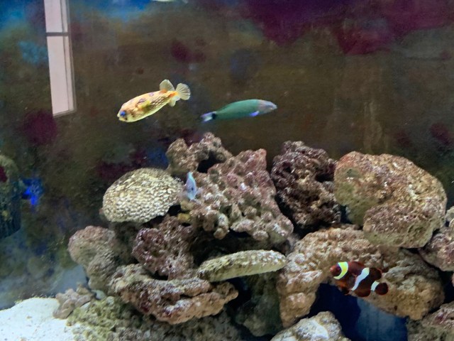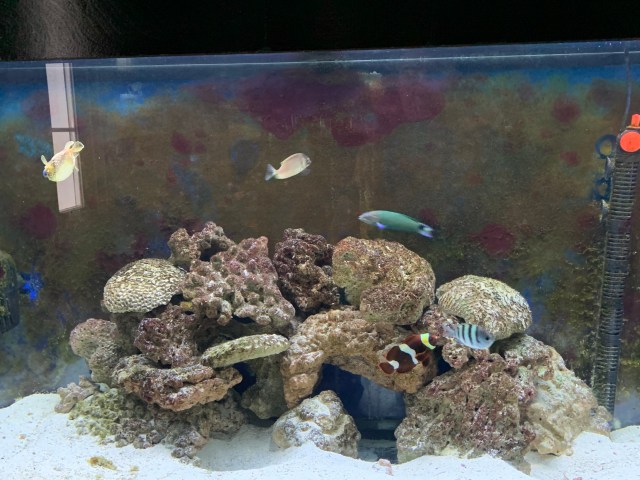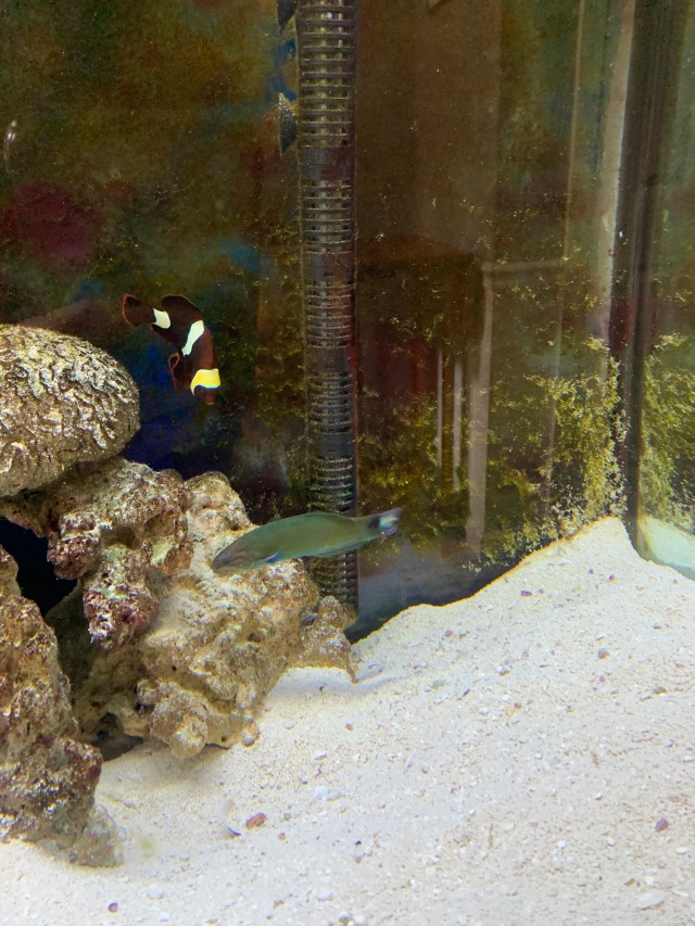 We have seven fish and a red sea cucumber now. One clown fish usually stays behind the rocks. I guess it’s her/his job to guard their territory in the tank. The clown fish are very territorial and will chase any other fish way from their place once they claim it. When we add new fish to the tank we have to make sure that the new additions are aggressive enough to stake their claim to being there.
