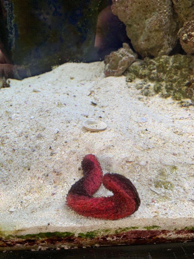 Since we lost a few fish we wanted to replace them with hardier fish. My husband purchased two new fish – a Sergeant Major, a Wrasse and a Sea Cucumber which cleans the bottom of the tank – a good thing to have. The Sea Cucumber is a weird-looking creature.