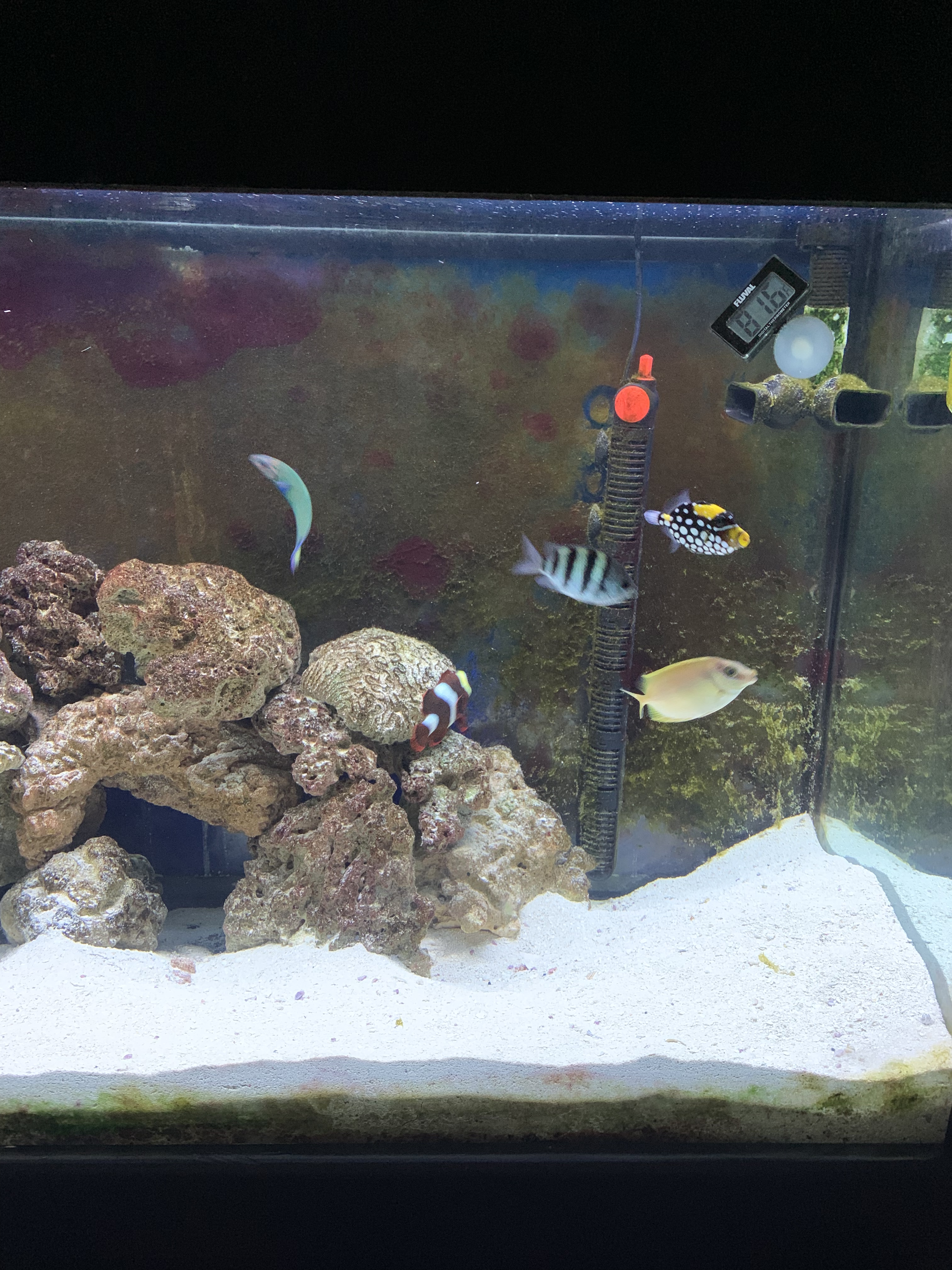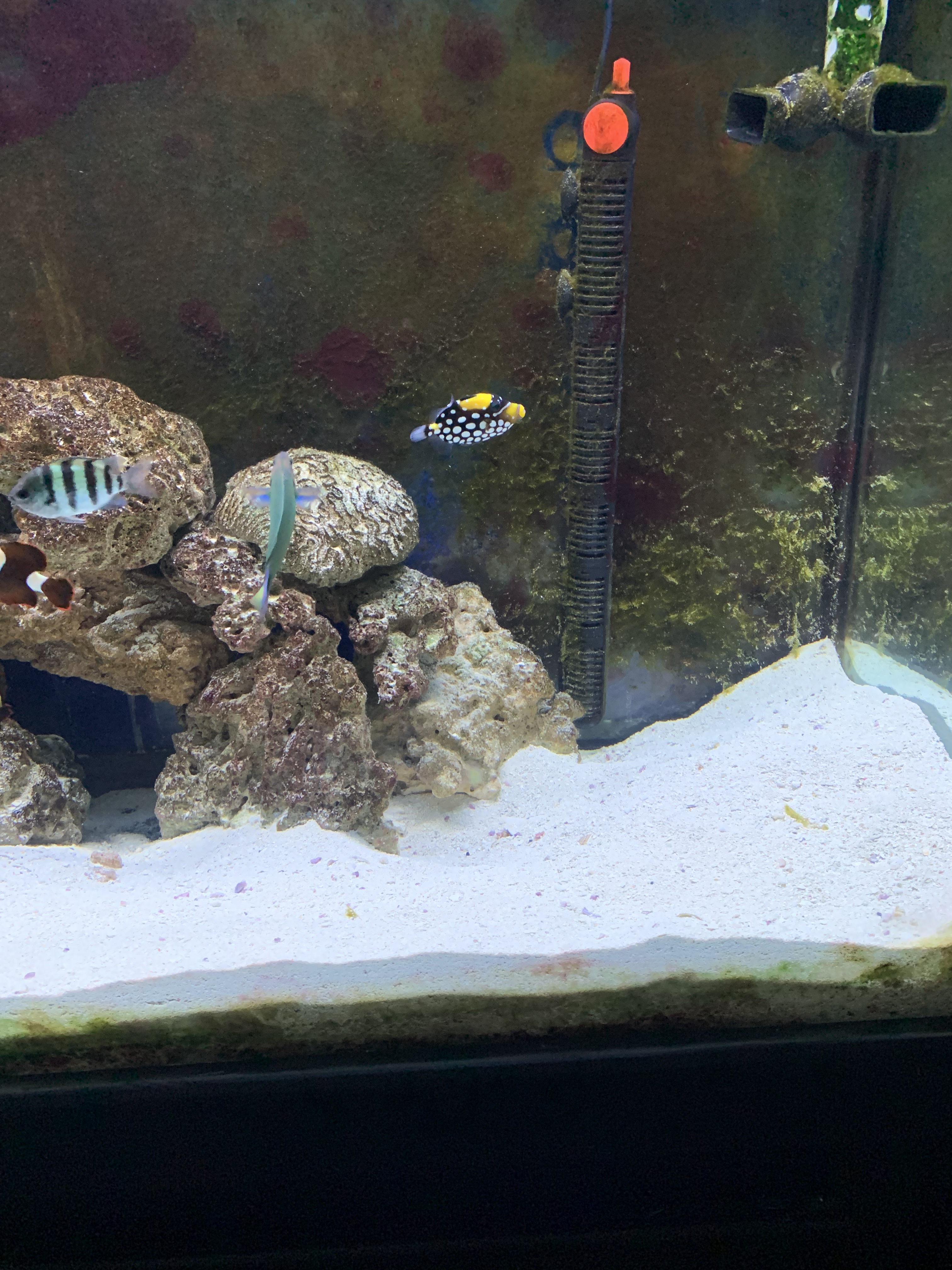 There is a clown hiding inside the rocks down on the lower right hand side of the tank. Do you see him (orange & white stripes)?
