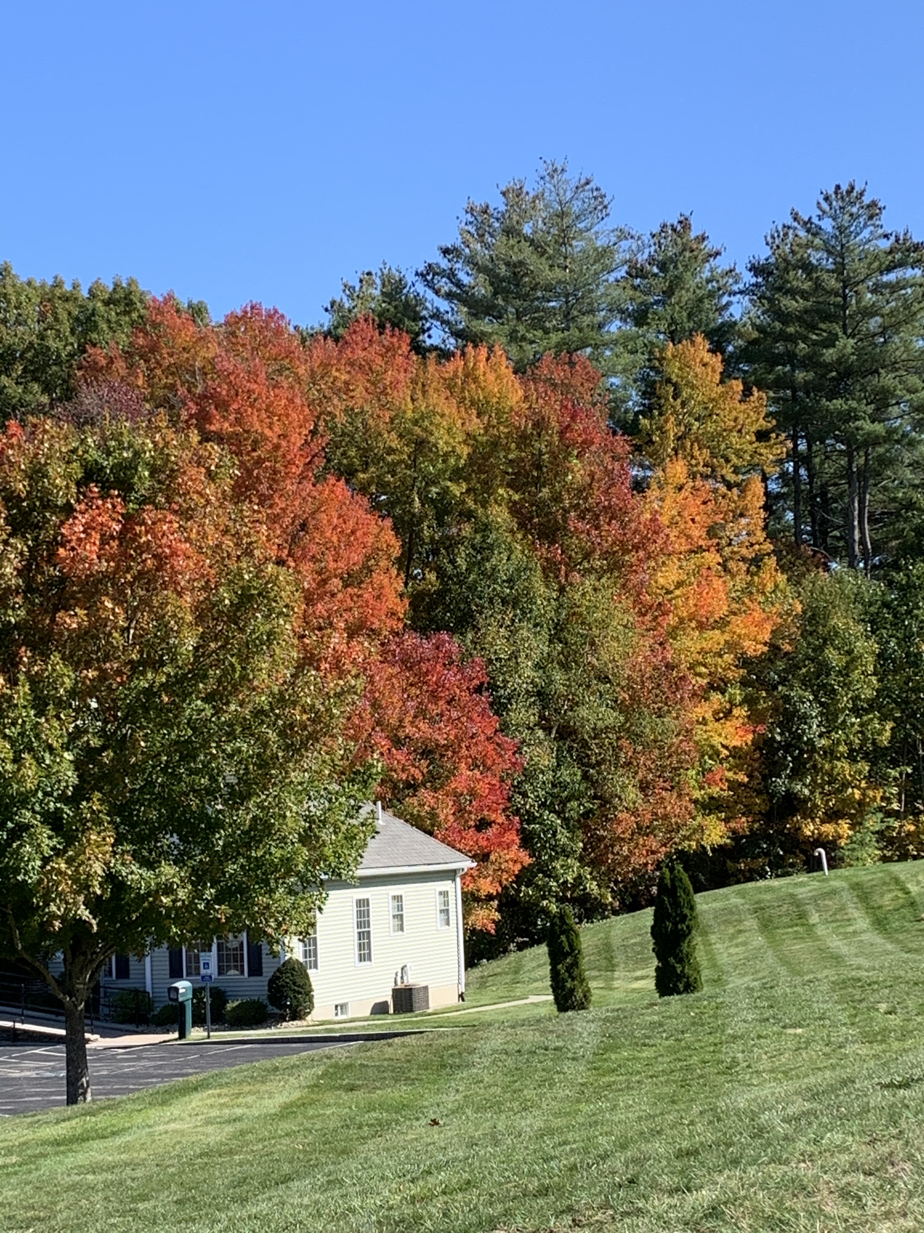 This year the weather has been so strange that we may not have as many trees change as in previous years. The weather needs to be warm during the day and cool at night. We have had some warm days and warm nights so the chlorophyll is not affected in the same way. It stills flows upward to the top leaves. It is supposed to be curtailed in the cooler nights and cannot travel up into the upper branches to feed them thus causing the change in the color of the leaves.