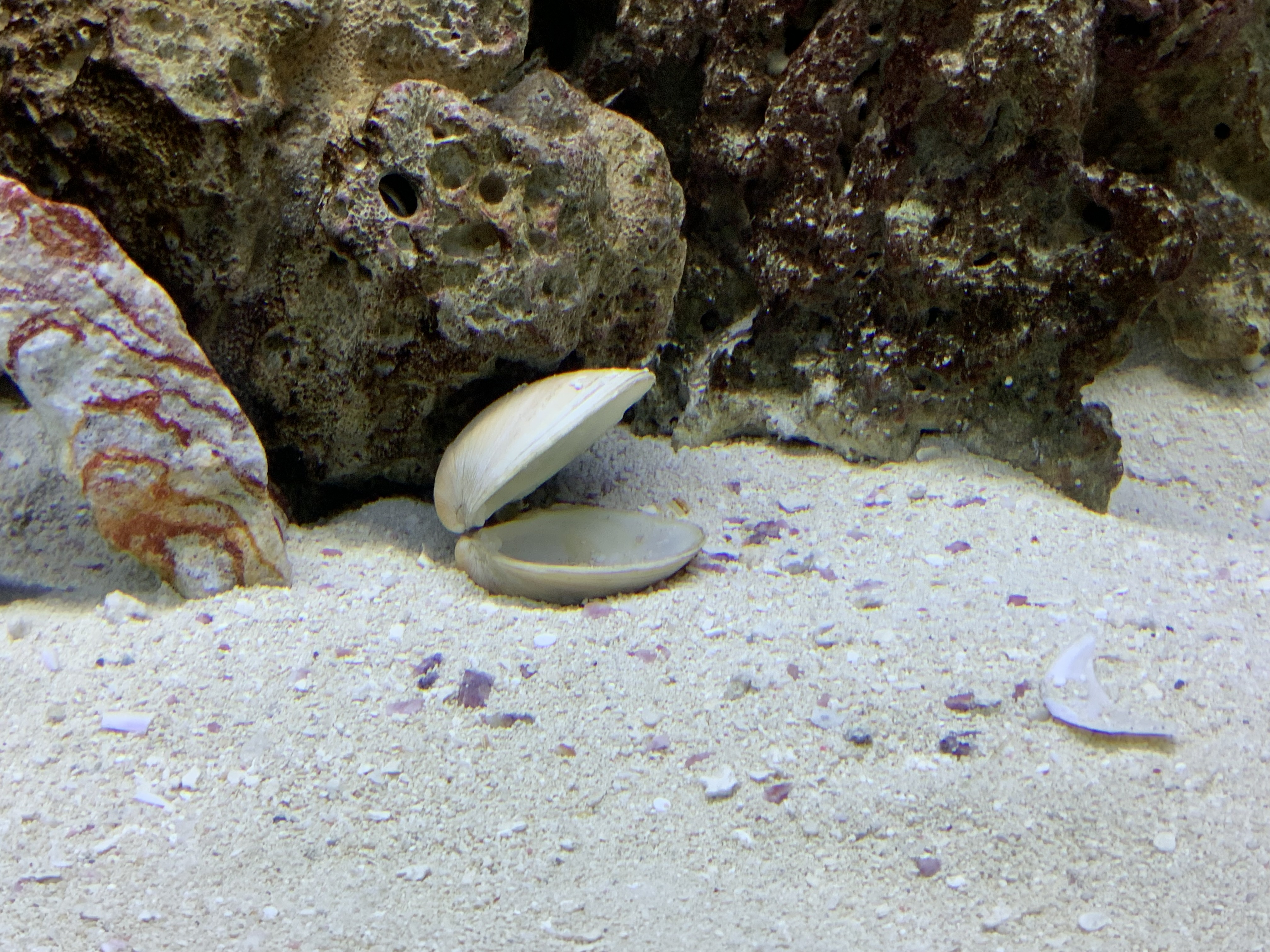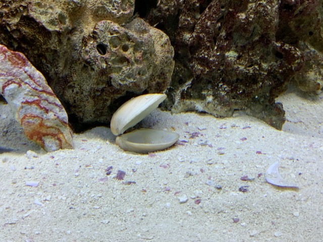 Here is another interesting mystery in the tank. My husband, the keeper of the tank, had dropped in this clam a couple of months ago. It was a live clam that he purchased from the fish department of the grocery store. It had buried itself in the sand and was living there ever since until recently. How? It lived on the debris and food leftovers that sink to the bottom.
