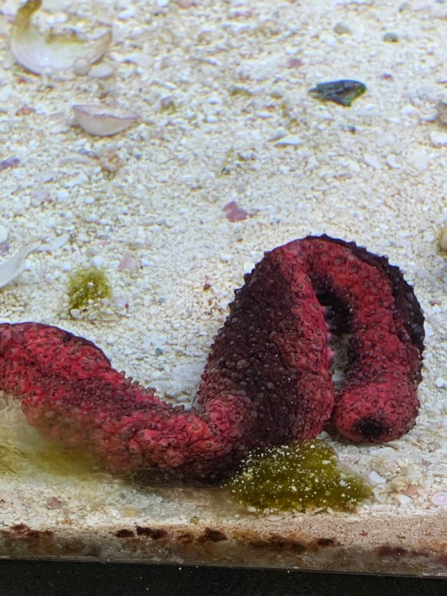 In this photo above Red has pushed himself tightly against the glass in the corner when he noticed that Chippy was coming his way. Sea Cucumbers don’t move much if at all but starfish can move quicker. We watched Chippy as he moved as fast as his five legs and tentacles could propel him. It wasn’t really fast but a little faster than a snail. They appear to glide above the sand.