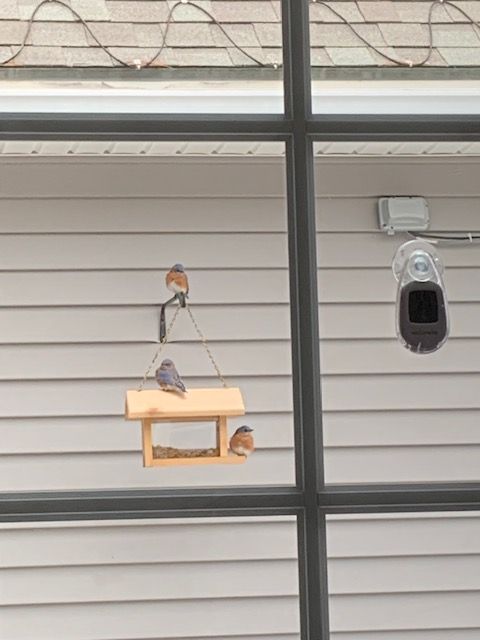 Here are some beautiful bluebirds at our special bluebird feeder. This feeder contains dried meal worms which are their favorite. There is only one hole on the front for them to enter and leave. Some birds are a little skittish about going in. They must be claustrophobic like me. Others are brave and fly in and out with precision. They are amazing! They pick up a few worms and fly back out maybe to feed their mates or friends or just to snack on themselves. I was lucky to capture three lovely bluebirds this time. They usually don’t stay there too long. They wait their turn to enter and feed.