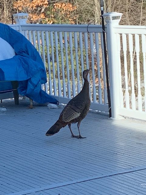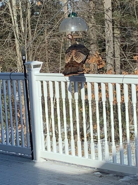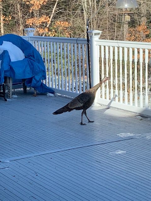 Here are some photos I took recently of a visiting turkey and some bluebirds. The first few photos are of a young turkey who was curious about our deck. The turkeys always stay below the deck to feed off of the seeds that the smaller birds drop. Most of the turkeys and other little critters are content picking up the scraps. But not this particular turkey – he wanted to go right to the source. Of course, once he was up on the deck, he didn’t know what to do. He couldn’t access the feeders because he was too big. Poor guy. He finally gave up and flew away. But it was fun watching him strut around like a proud peacock. It was fascinating to see how they can fly even with their large girth. They are able to fly quite high to get into the tall fir trees to roost at night.