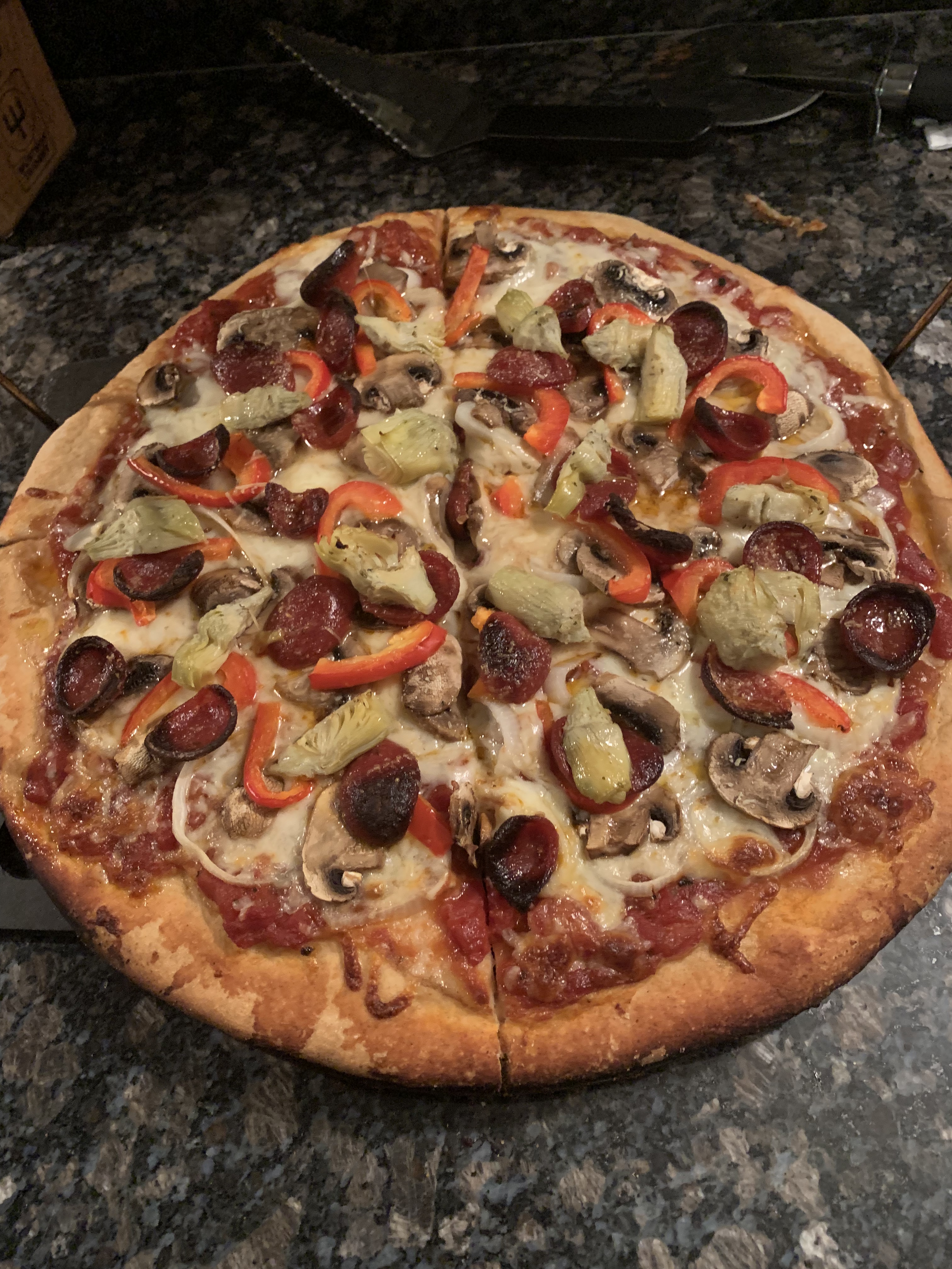 Pizza with artichoke hearts, red peppers, mushrooms and pepperoni