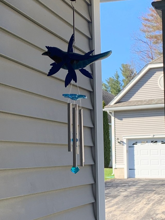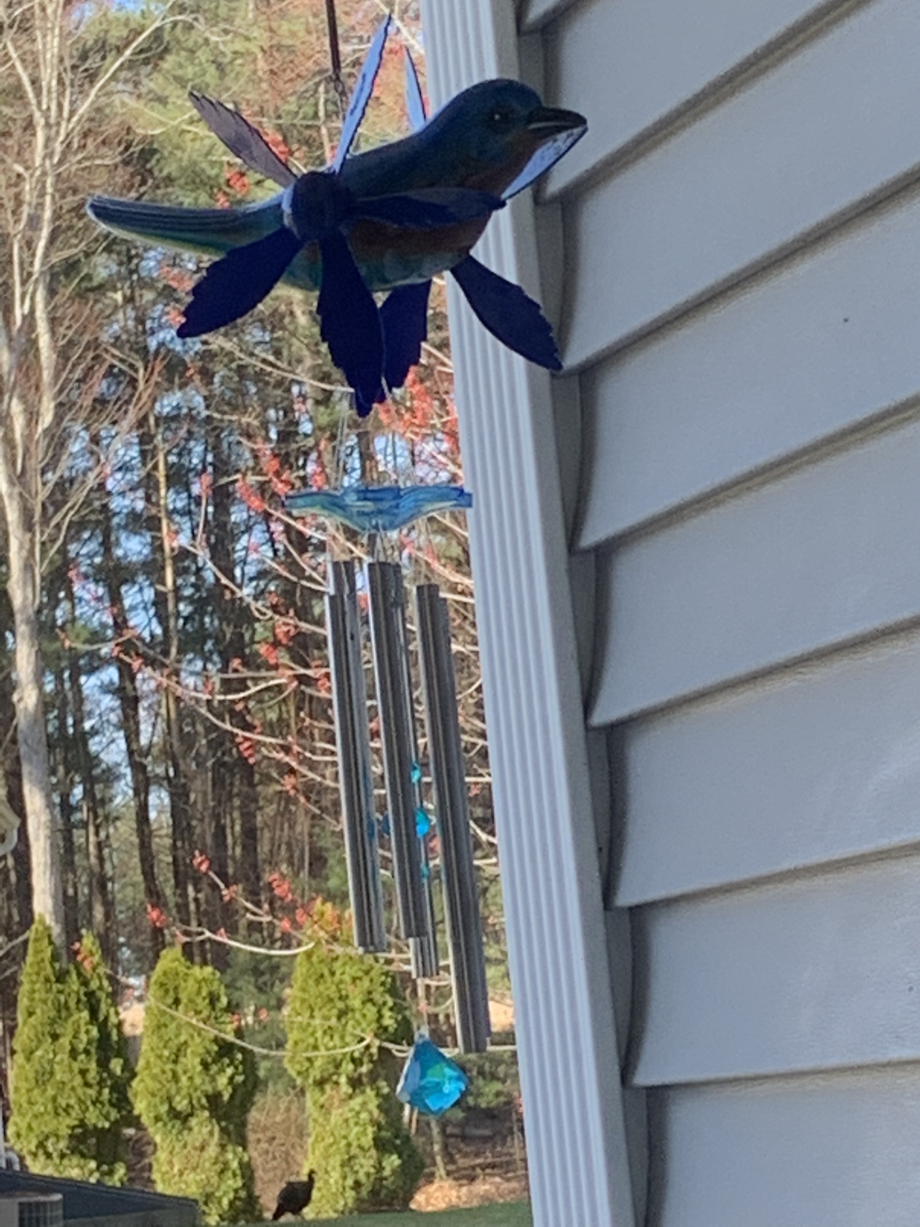 We purchased two of these whirly bluebirds with chimes instead of flowers that have to be watered and tended. They always make so much of a mess on our front deck. These birds are beautiful and fascinating to watched as they whirl and twirl. We haven’t gotten enough wind to work the chimes yet.