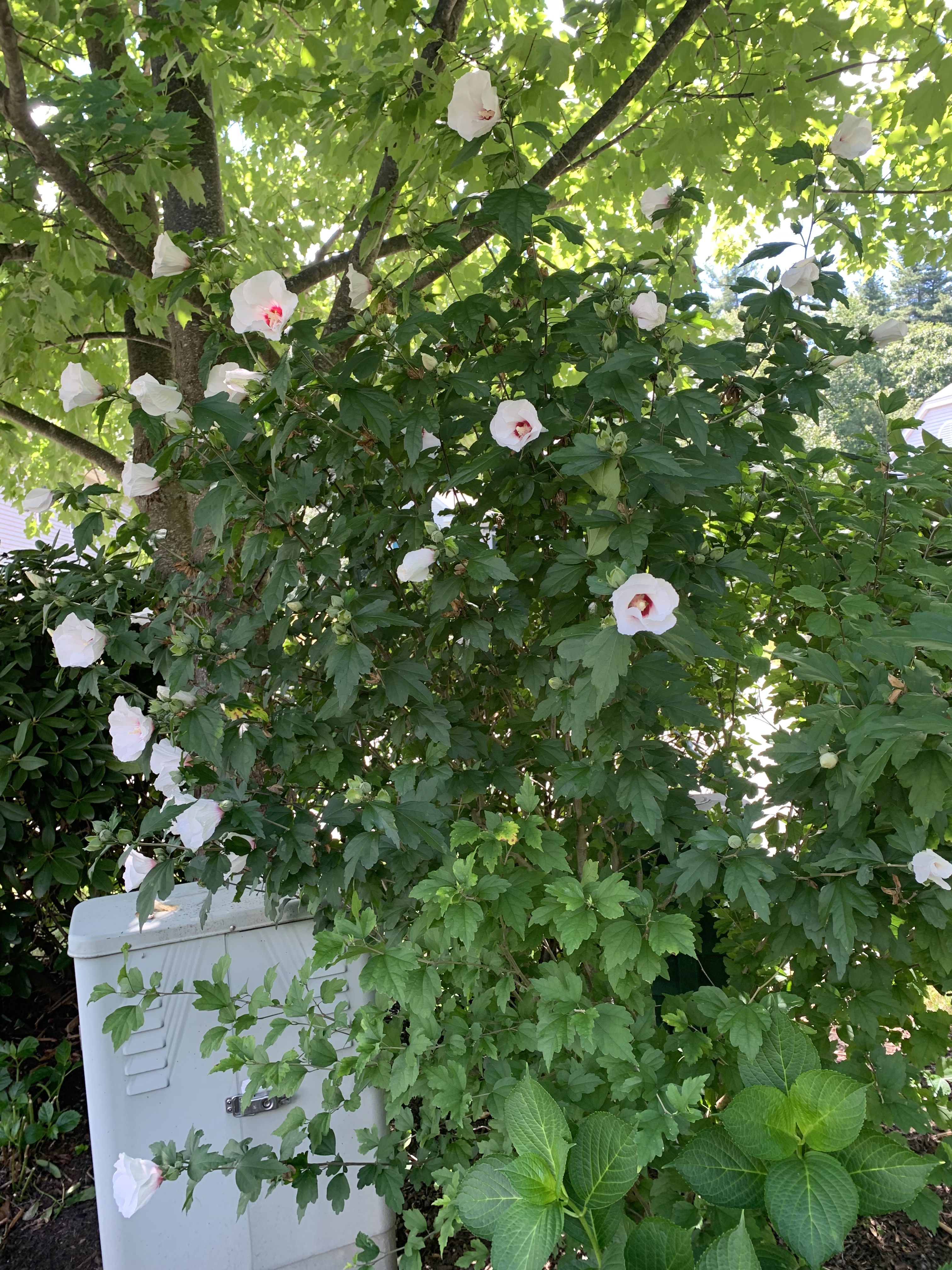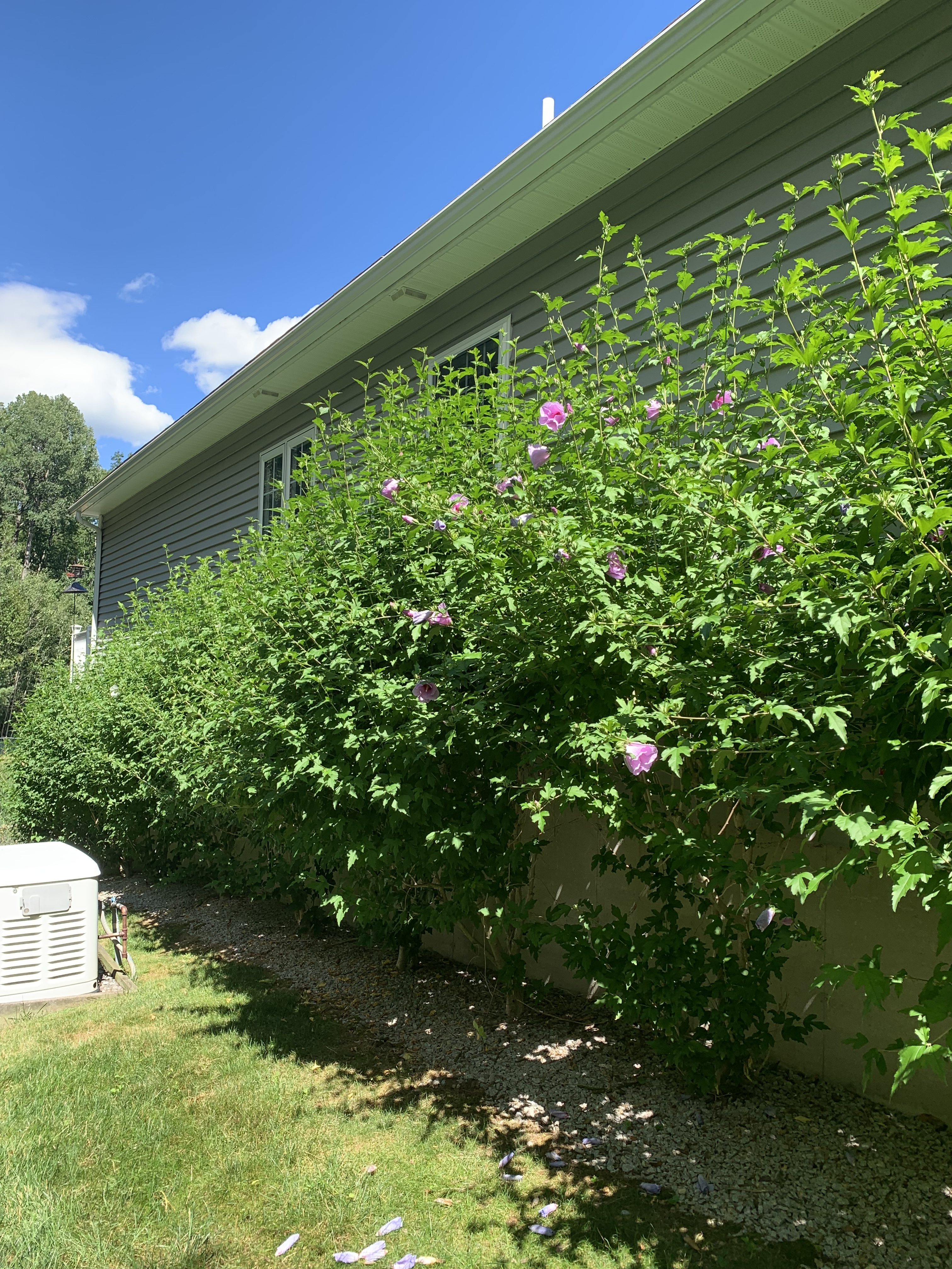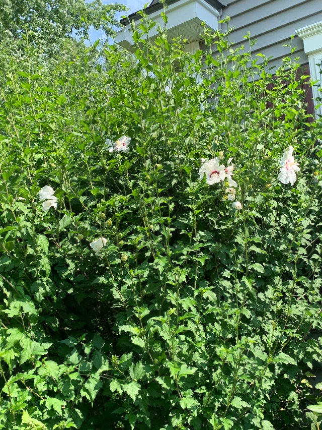 The mother bush above used to have pinkish/purple flowers but is now all white. Part of the bush died a few years ago and was pulled out leaving this one with all white blooms. I’ve noticed that some of the other transplants have begun to have dual colors too. They can change with each year too because of the pollinating of the bees and birds who spread the pollen from plant to plant thus creating new flowers. They are breathtakingly beautiful! People driving by stop to admire them but only see five on one side of the house facing the street and two bushes in front. The other ten bushes are on the other side of the house away from the street.